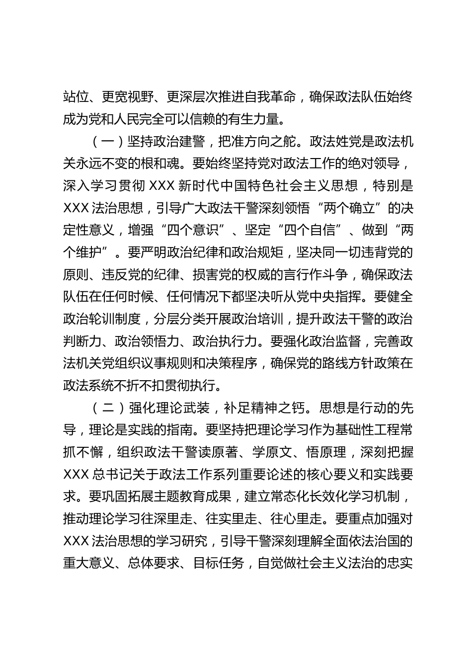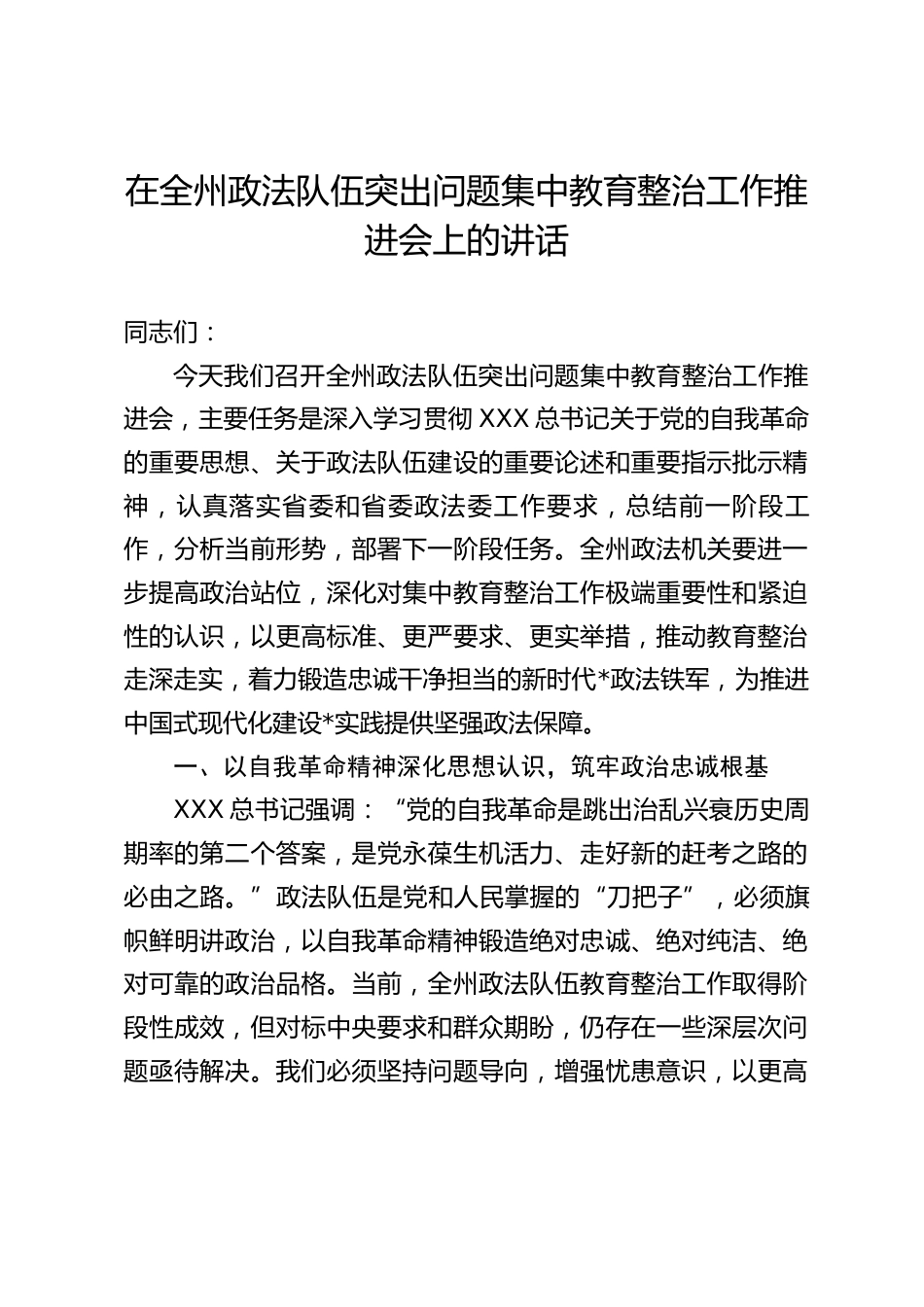在全州政法隊(duì)伍突出問題集中教育整治工作推進(jìn)會(huì)上的講話同志們:今天我們召開全州政法隊(duì)伍突出問題集中教育整治工作推進(jìn)會(huì),主要任務(wù)是深入學(xué)習(xí)貫徹XXX總書記關(guān)于黨的自我革命的重要思想、關(guān)于政法隊(duì)伍建設(shè)的重要論述和重要指示批示精神,認(rèn)真落實(shí)省委和省委政法委工作要求,總結(jié)前一階段工作,分析當(dāng)前形勢(shì),部署下一階段任務(wù)。全州政法機(jī)關(guān)要進(jìn)一步提高政治站位,深化對(duì)集中教育整治工作極端重要性和緊迫性的認(rèn)識(shí),以更高標(biāo)準(zhǔn)、更嚴(yán)要求、更實(shí)舉措,推動(dòng)教育整治走深走實(shí),著力鍛造忠誠(chéng)干凈擔(dān)當(dāng)?shù)男聲r(shí)代*政法鐵軍,為推進(jìn)中國(guó)式現(xiàn)代化建設(shè)*實(shí)踐提供堅(jiān)強(qiáng)政法保障。一、...