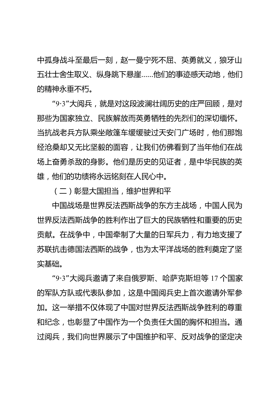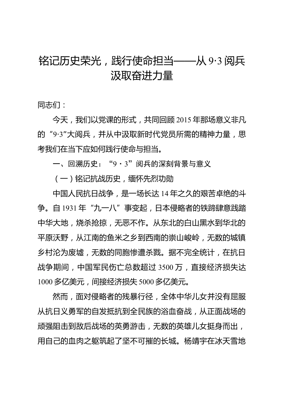 銘記歷史榮光,踐行使命擔(dān)當(dāng)——從9·3閱兵汲取奮進(jìn)力量同志們:今天,我們以黨課的形式,共同回顧2015年那場(chǎng)意義非凡的“9·3”大閱兵,并從中汲取新時(shí)代黨員所需的精神力量,思考我們?cè)诋?dāng)下應(yīng)如何踐行使命與擔(dān)當(dāng)。一、回溯歷史:“9·3”閱兵的深刻背景與意義(一)銘記抗戰(zhàn)歷史,緬懷先烈功勛中國(guó)人民抗日戰(zhàn)爭(zhēng),是一場(chǎng)長(zhǎng)達(dá)14年之久的艱苦卓絕的斗爭(zhēng)。自1931年“九一八”事變起,日本侵略者的鐵蹄肆意踐踏中華大地,燒殺搶掠,無(wú)惡不作。從東北的白山黑水到華北的平原沃野,從江南的魚米之鄉(xiāng)到西南的崇山峻嶺,無(wú)數(shù)的城鎮(zhèn)鄉(xiāng)村淪為廢墟,無(wú)數(shù)的同胞慘遭殺戮。據(jù)不完全統(tǒng)...
