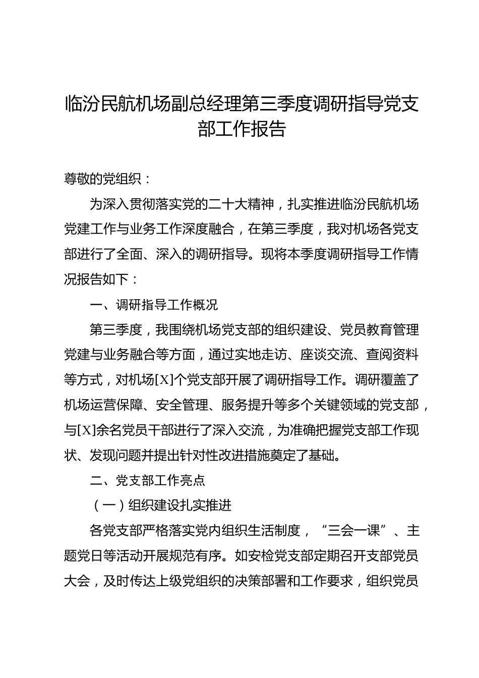 臨汾民航機(jī)場(chǎng)副總經(jīng)理第三季度調(diào)研指導(dǎo)黨支部工作報(bào)告