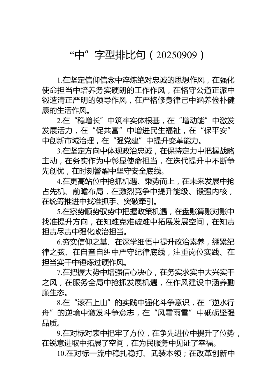 “中”字型排比句(20250909)1.在堅(jiān)定信仰信念中淬煉絕對(duì)忠誠(chéng)的思想作風(fēng),在強(qiáng)化使命擔(dān)當(dāng)中培養(yǎng)務(wù)實(shí)硬朗的工作作風(fēng),在恪守公道正派中鍛造清正嚴(yán)明的領(lǐng)導(dǎo)作風(fēng),在嚴(yán)格修身律己中涵養(yǎng)儉樸健康的生活作風(fēng)。2.在“穩(wěn)增長(zhǎng)”中筑牢實(shí)體根基,在“增動(dòng)能”中激發(fā)發(fā)展活力,在“促共富”中增進(jìn)民生福祉,在“保平安”中創(chuàng)新市域治理,在“強(qiáng)黨建”中提升變革能力。3.在堅(jiān)定方向中體現(xiàn)政治忠誠(chéng),在保持定力中把握戰(zhàn)略主動(dòng),在務(wù)實(shí)作為中彰顯使命擔(dān)當(dāng),在迭代提升中不斷爭(zhēng)先創(chuàng)優(yōu),在時(shí)刻警醒中堅(jiān)守安全底線。4.在更高站位中搶抓機(jī)遇、乘勢(shì)而上,在未來(lái)發(fā)展中搶占先機(jī)、前瞻布局,...