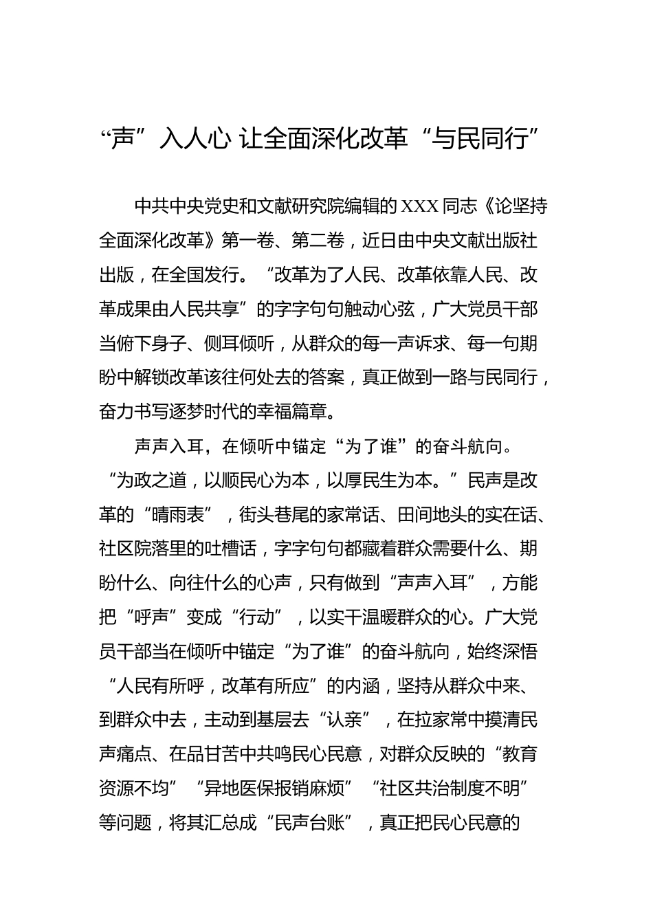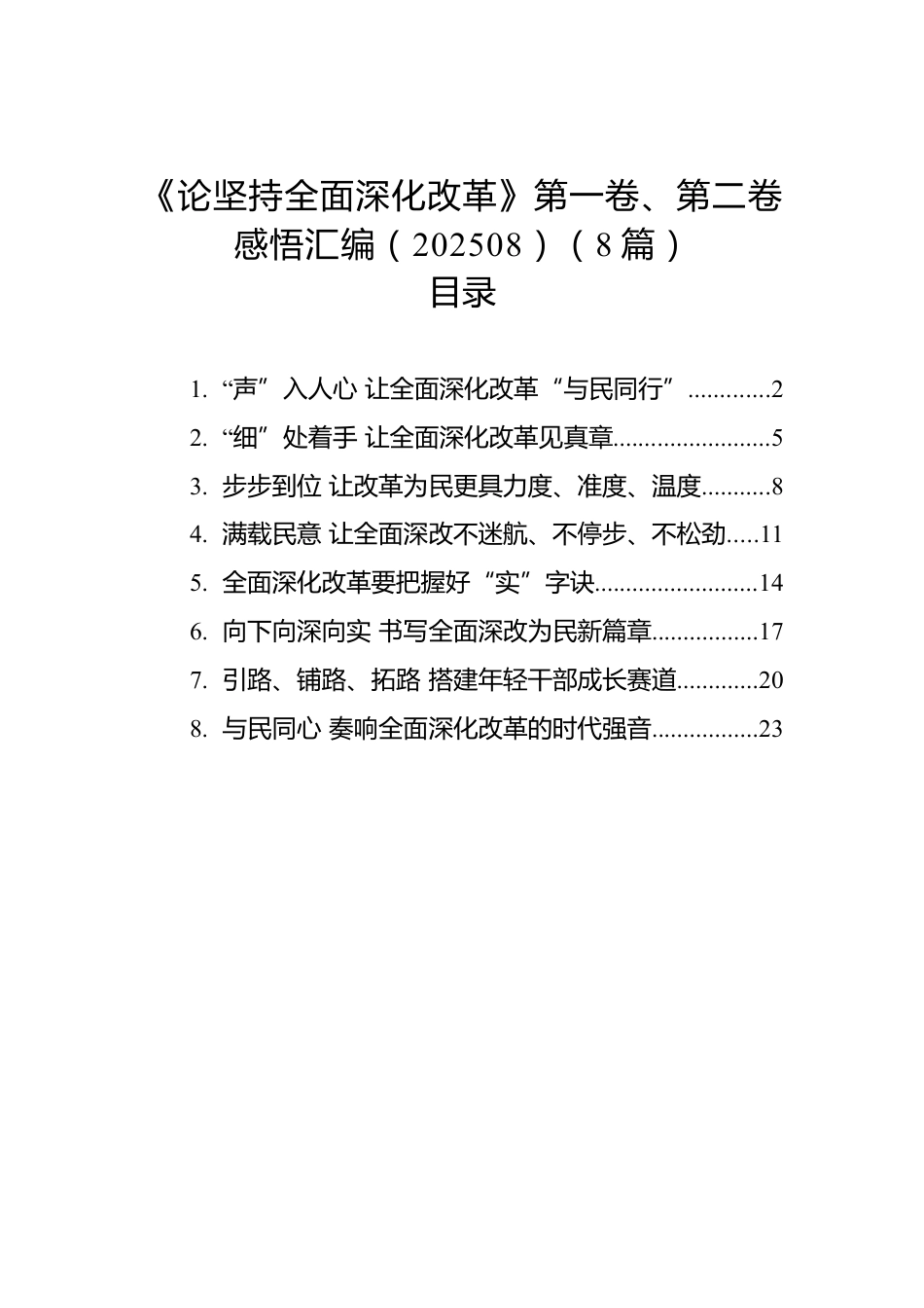 《論堅(jiān)持全面深化改革》第一卷、第二卷感悟匯編(202508)(8篇)目錄1.“聲”入人心讓全面深化改革“與民同行”.............22.“細(xì)”處著手讓全面深化改革見真章.........................53.步步到位讓改革為民更具力度、準(zhǔn)度、溫度...........84.滿載民意讓全面深改不迷航、不停步、不松勁.....115.全面深化改革要把握好“實(shí)”字訣..........................146.向下向深向?qū)崟鴮懭嫔罡臑槊裥缕?................177.引路、鋪路、拓路搭建年輕干部成長(zhǎng)賽道.............208.與民同心奏響全面深化改革的時(shí)代強(qiáng)音.................23“聲”入人心讓全面深化改革...