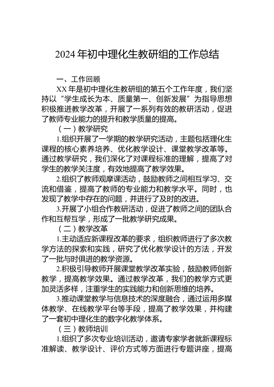 2024年初中理化生教研組的工作總結(jié)一、工作回顧XX年是初中理化生教研組的第五個(gè)工作年度,我們堅(jiān)持以“學(xué)生成長(zhǎng)為本、質(zhì)量第一、創(chuàng)新發(fā)展”為指導(dǎo)思想積極推進(jìn)教學(xué)改革,開展了一系列有效的教研活動(dòng),促進(jìn)了教師專業(yè)能力的提升和教學(xué)質(zhì)量的提高。(一)教學(xué)研究1.組織開展了一學(xué)期的教學(xué)研究活動(dòng),主題包括理化生課程的核心素養(yǎng)培養(yǎng)、優(yōu)化教學(xué)設(shè)計(jì)、課堂教學(xué)改革等。通過教學(xué)研究,我們深化了對(duì)課程標(biāo)準(zhǔn)的理解,提高了對(duì)學(xué)生的教學(xué)關(guān)注度,有效地提高了教學(xué)效果。2.組織了教師觀摩課活動(dòng),鼓勵(lì)教師之間相互學(xué)習(xí)、交流和借鑒,提高了教師的專業(yè)能力和教學(xué)水平。同時(shí),也發(fā)...