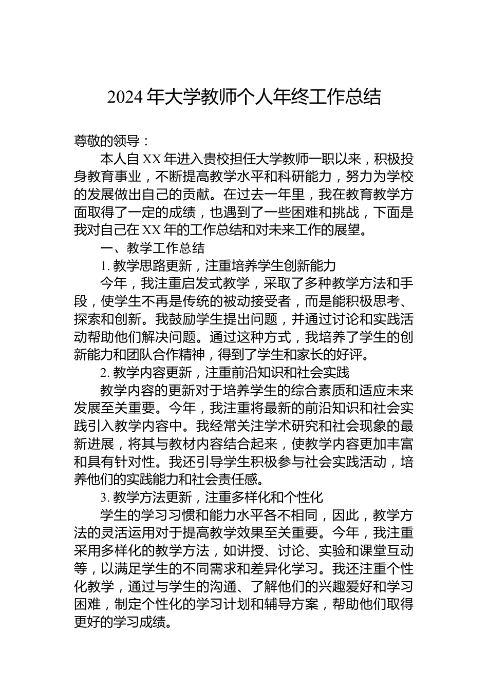 2024年大學教師個人年終工作總結尊敬的領導:本人自XX年進入貴校擔任大學教師一職以來,積極投身教育事業(yè),不斷提高教學水平和科研能力,努力為學校的發(fā)展做出自己的貢獻。在過去一年里,我在教育教學方面取得了一定的成績,也遇到了一些困難和挑戰(zhàn),下面是我對自己在XX年的工作總結和對未來工作的展望。一、教學工作總結1.教學思路更新,注重培養(yǎng)學生創(chuàng)新能力今年,我注重啟發(fā)式教學,采取了多種教學方法和手段,使學生不再是傳統(tǒng)的被動接受者,而是能積極思考、探索和創(chuàng)新。我鼓勵學生提出問題,并通過討論和實踐活動幫助他們解決問題。通過這種方式,我培養(yǎng)了學生的創(chuàng)...