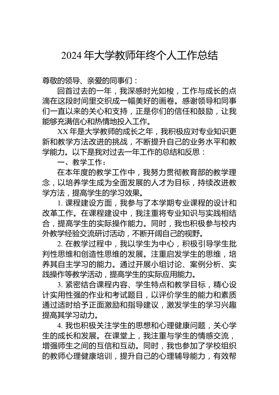 2024年大學(xué)教師年終個人工作總結(jié)尊敬的領(lǐng)導(dǎo)、親愛的同事們:回首過去的一年,我深感時光如梭,工作與成長的點(diǎn)滴在這段時間里交織成一幅美好的畫卷。感謝領(lǐng)導(dǎo)和同事們一直以來的關(guān)心和支持,正是你們的信任和鼓勵,讓我能夠充滿信心和熱情地投入工作。XX年是大學(xué)教師的成長之年,我積極應(yīng)對專業(yè)知識更新和教學(xué)方法改進(jìn)的挑戰(zhàn),不斷提升自己的業(yè)務(wù)水平和教學(xué)能力。以下是我對過去一年工作的總結(jié)和反思:一、教學(xué)工作:在本年度的教學(xué)工作中,我努力貫徹教育部的教學(xué)理念,以培養(yǎng)學(xué)生成為全面發(fā)展的人才為目標(biāo),持續(xù)改進(jìn)教學(xué)方法,提高學(xué)生的學(xué)習(xí)效果。1.課程建設(shè)方面,我參...
