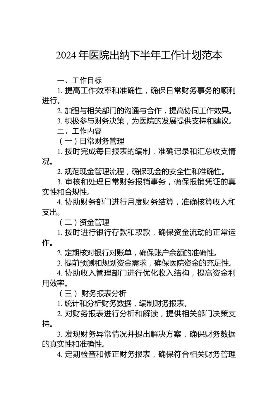 2024年醫(yī)院出納下半年工作計劃范本