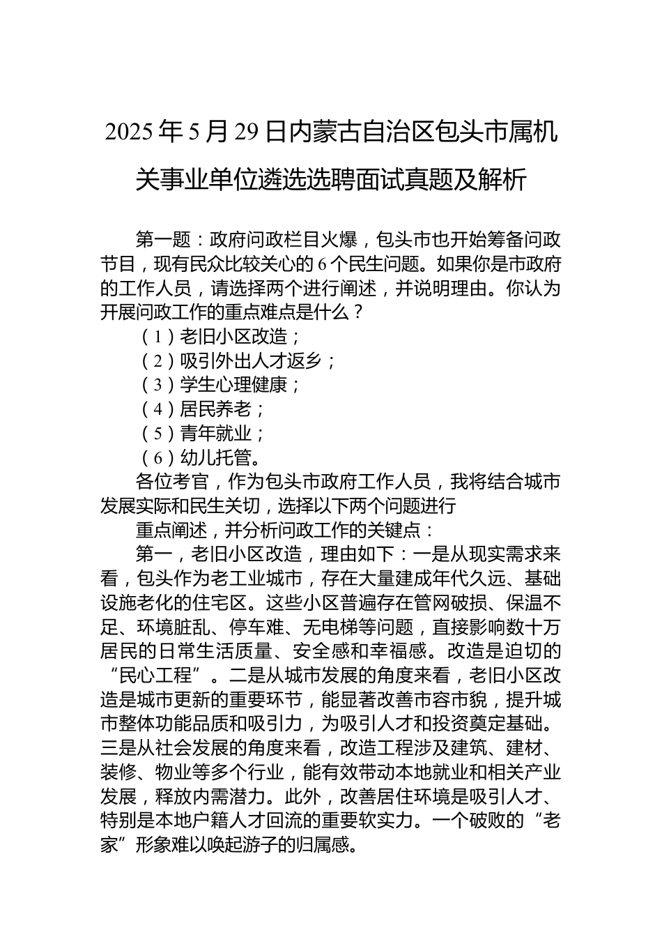 2025年5月29日內(nèi)蒙古自治區(qū)包頭市屬機(jī)關(guān)事業(yè)單位遴選選聘面試真題及解析第一題:政府問政欄目火爆,包頭市也開始籌備問政節(jié)目,現(xiàn)有民眾比較關(guān)心的6個(gè)民生問題。如果你是市政府的工作人員,請選擇兩個(gè)進(jìn)行闡述,并說明理由。你認(rèn)為開展問政工作的重點(diǎn)難點(diǎn)是什么?(1)老舊小區(qū)改造;(2)吸引外出人才返鄉(xiāng);(3)學(xué)生心理健康;(4)居民養(yǎng)老;(5)青年就業(yè);(6)幼兒托管。各位考官,作為包頭市政府工作人員,我將結(jié)合城市發(fā)展實(shí)際和民生關(guān)切,選擇以下兩個(gè)問題進(jìn)行重點(diǎn)闡述,并分析問政工作的關(guān)鍵點(diǎn):第一,老舊小區(qū)改造,理由如下:一是從現(xiàn)實(shí)需求來看,包頭作為老...