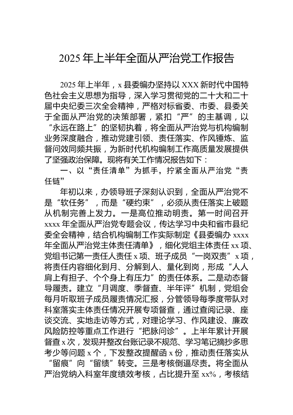 2025年上半年全面從嚴(yán)治黨工作報(bào)告材料匯編(9篇)目錄1.2025年上半年全面從嚴(yán)治黨工作報(bào)告...................................22.2025年上半年全面從嚴(yán)治黨工作報(bào)告.................................83.2025年上半年全面從嚴(yán)治黨工作報(bào)告...............................164.2025年上半年全面從嚴(yán)治黨工作報(bào)告...............................205.2025年上半年全面從嚴(yán)治黨工作報(bào)告...............................276.市人大常委會(huì)機(jī)關(guān)黨委2025年上半年落實(shí)全面從嚴(yán)治黨主體責(zé)任工作情況報(bào)告?...........................................................327.2025...