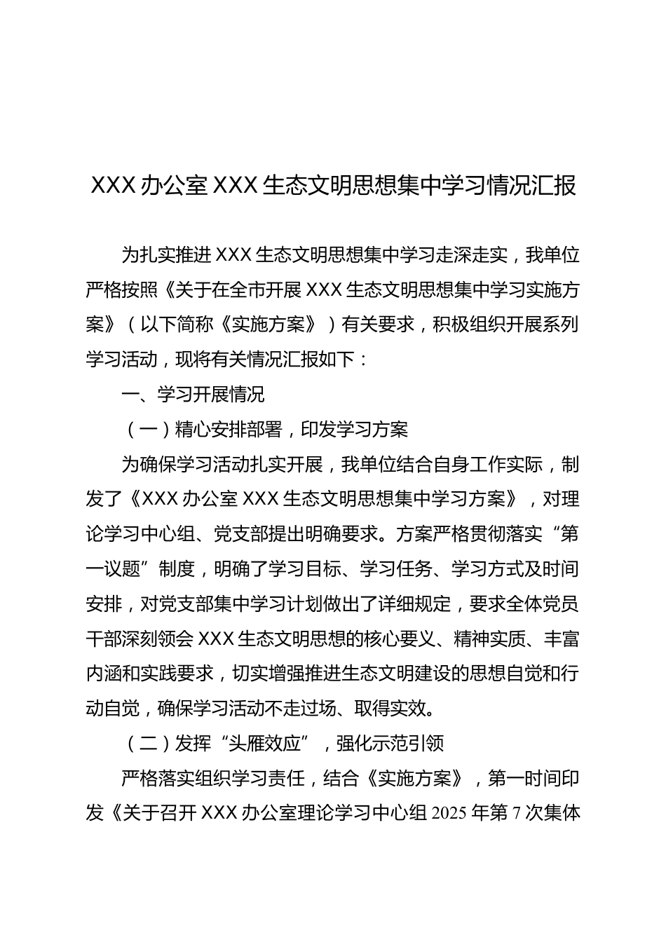 XX辦公室生態(tài)文明思想集中學(xué)習(xí)情況匯報(bào)