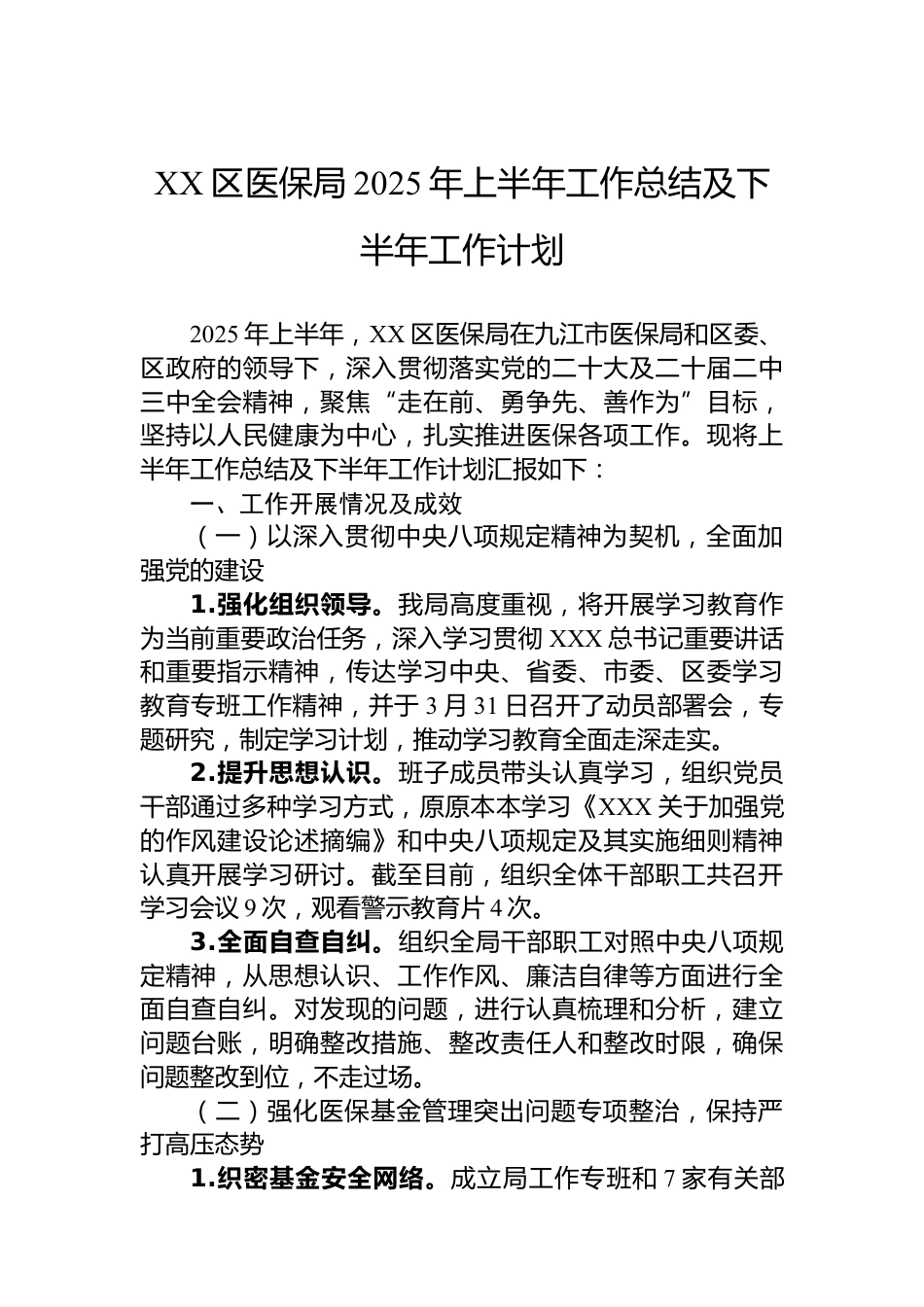 XX區(qū)醫(yī)保局2025年上半年工作總結(jié)及下半年工作計(jì)劃2025年上半年,XX區(qū)醫(yī)保局在九江市醫(yī)保局和區(qū)委、區(qū)政府的領(lǐng)導(dǎo)下,深入貫徹落實(shí)黨的二十大及二十屆二中三中全會(huì)精神,聚焦“走在前、勇爭先、善作為”目標(biāo),堅(jiān)持以人民健康為中心,扎實(shí)推進(jìn)醫(yī)保各項(xiàng)工作。現(xiàn)將上半年工作總結(jié)及下半年工作計(jì)劃匯報(bào)如下:一、工作開展情況及成效(一)以深入貫徹中央八項(xiàng)規(guī)定精神為契機(jī),全面加強(qiáng)黨的建設(shè)1.強(qiáng)化組織領(lǐng)導(dǎo)。我局高度重視,將開展學(xué)習(xí)教育作為當(dāng)前重要政治任務(wù),深入學(xué)習(xí)貫徹XXX總書記重要講話和重要指示精神,傳達(dá)學(xué)習(xí)中央、省委、市委、區(qū)委學(xué)習(xí)教育專班工作精神,并于3月31...