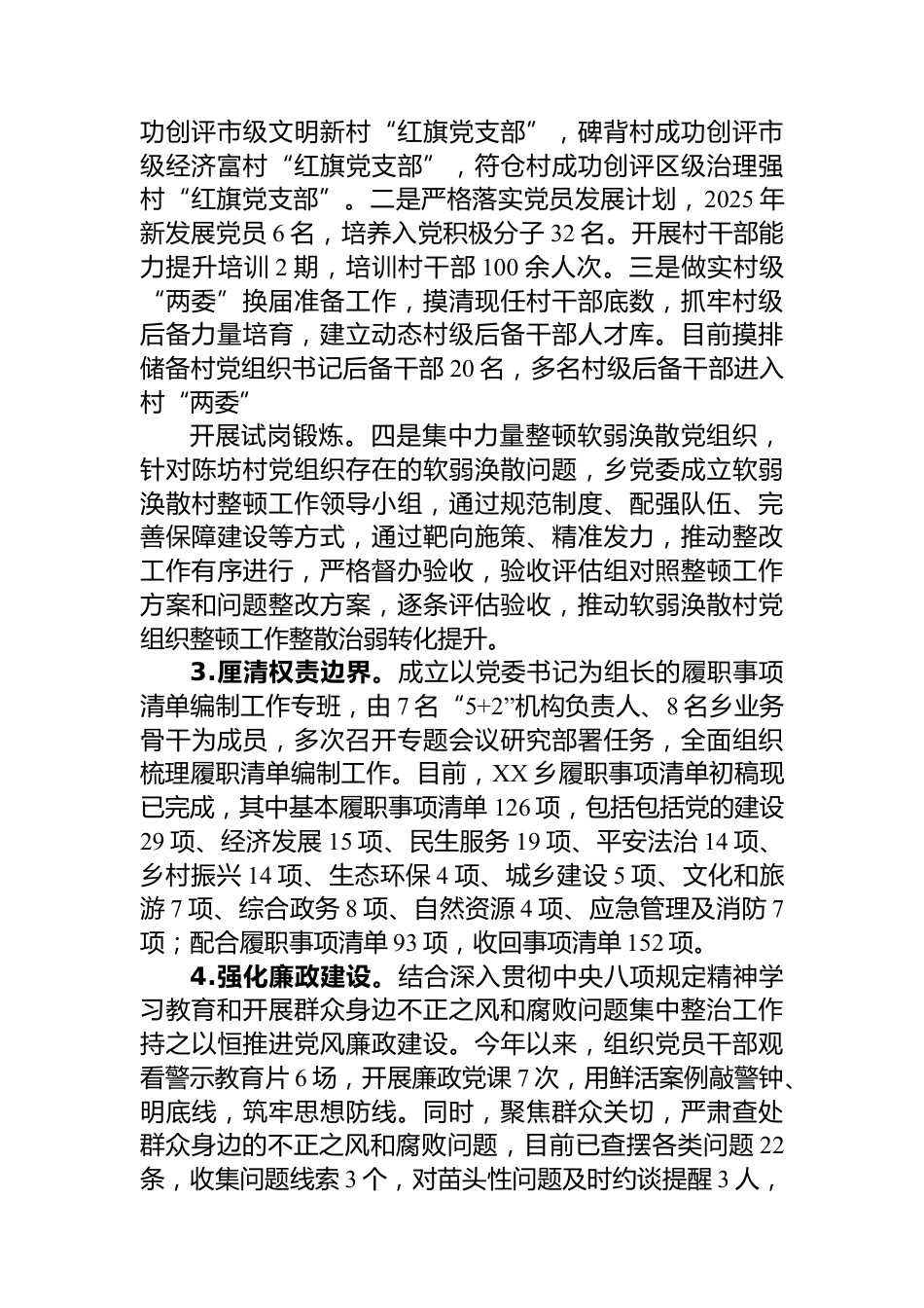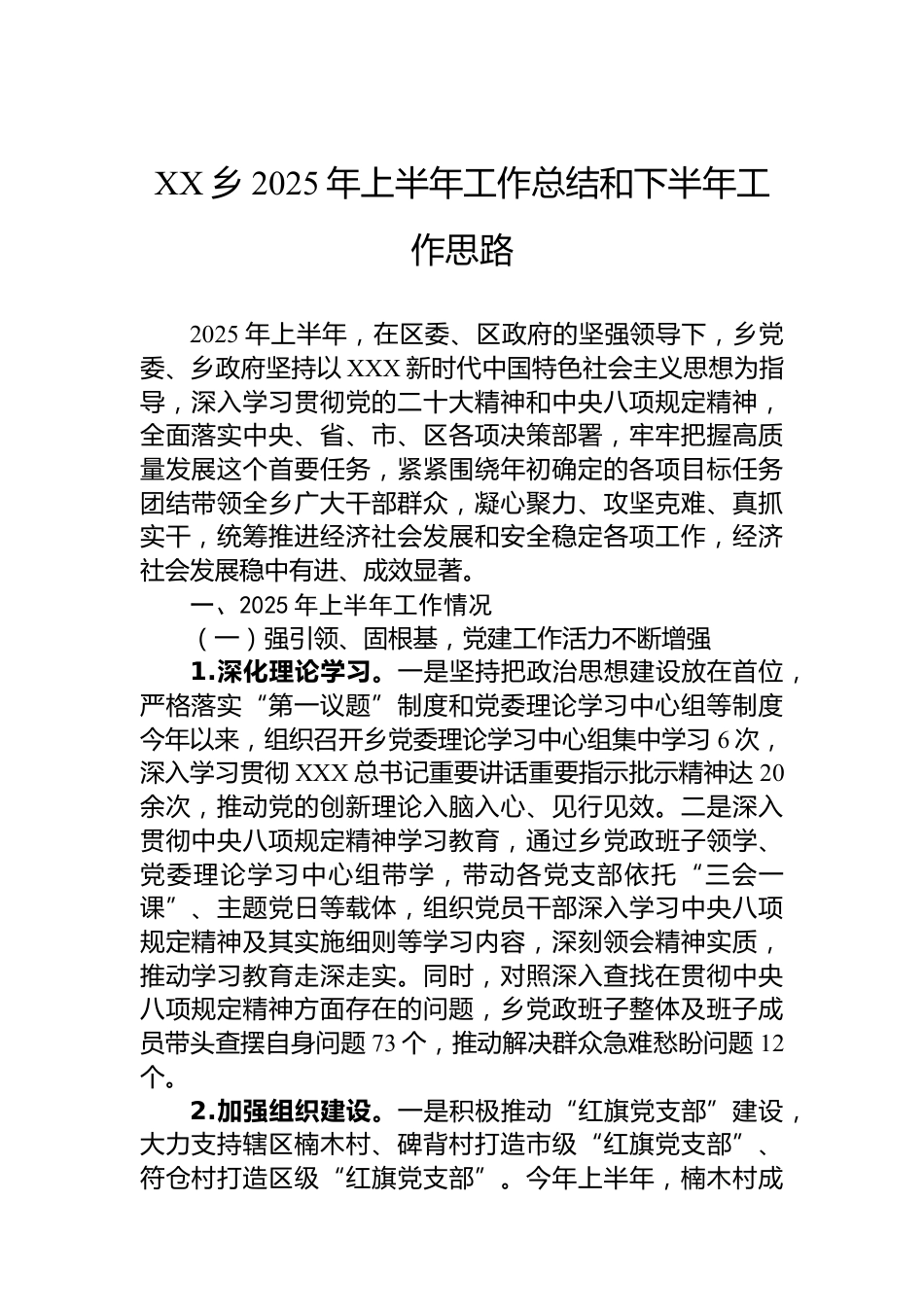 XX鄉(xiāng)2025年上半年工作總結(jié)和下半年工作思路2025年上半年,在區(qū)委、區(qū)政府的堅強領導下,鄉(xiāng)黨委、鄉(xiāng)政府堅持以XXX新時代中國特色社會主義思想為指導,深入學習貫徹黨的二十大精神和中央八項規(guī)定精神,全面落實中央、省、市、區(qū)各項決策部署,牢牢把握高質(zhì)量發(fā)展這個首要任務,緊緊圍繞年初確定的各項目標任務團結(jié)帶領全鄉(xiāng)廣大干部群眾,凝心聚力、攻堅克難、真抓實干,統(tǒng)籌推進經(jīng)濟社會發(fā)展和安全穩(wěn)定各項工作,經(jīng)濟社會發(fā)展穩(wěn)中有進、成效顯著。一、2025年上半年工作情況(一)強引領、固根基,黨建工作活力不斷增強1.深化理論學習。一是堅持把政治思想建設放在首位,嚴...