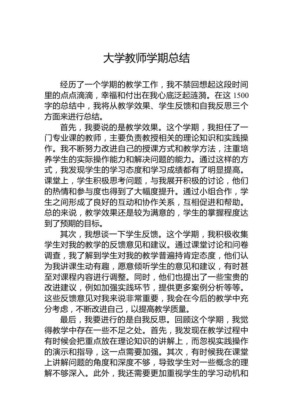 大學(xué)教師學(xué)期總結(jié)經(jīng)歷了一個(gè)學(xué)期的教學(xué)工作,我不禁回想起這段時(shí)間里的點(diǎn)點(diǎn)滴滴,幸福和付出在我心底泛起漣漪。在這1500字的總結(jié)中,我將從教學(xué)效果、學(xué)生反饋和自我反思三個(gè)方面來(lái)進(jìn)行總結(jié)。首先,我要說(shuō)的是教學(xué)效果。這個(gè)學(xué)期,我擔(dān)任了一門(mén)專(zhuān)業(yè)課的教師,主要負(fù)責(zé)教授相關(guān)的理論知識(shí)和實(shí)踐操作。我不斷努力改進(jìn)自己的授課方式和教學(xué)方法,注重培養(yǎng)學(xué)生的實(shí)際操作能力和解決問(wèn)題的能力。通過(guò)這樣的方式,我發(fā)現(xiàn)學(xué)生的學(xué)習(xí)態(tài)度和學(xué)習(xí)成績(jī)都有了明顯提高。課堂上,學(xué)生積極思考問(wèn)題,與我展開(kāi)積極的討論,他們的熱情和參與度也得到了大幅度提升。通過(guò)小組合作,學(xué)生之間...