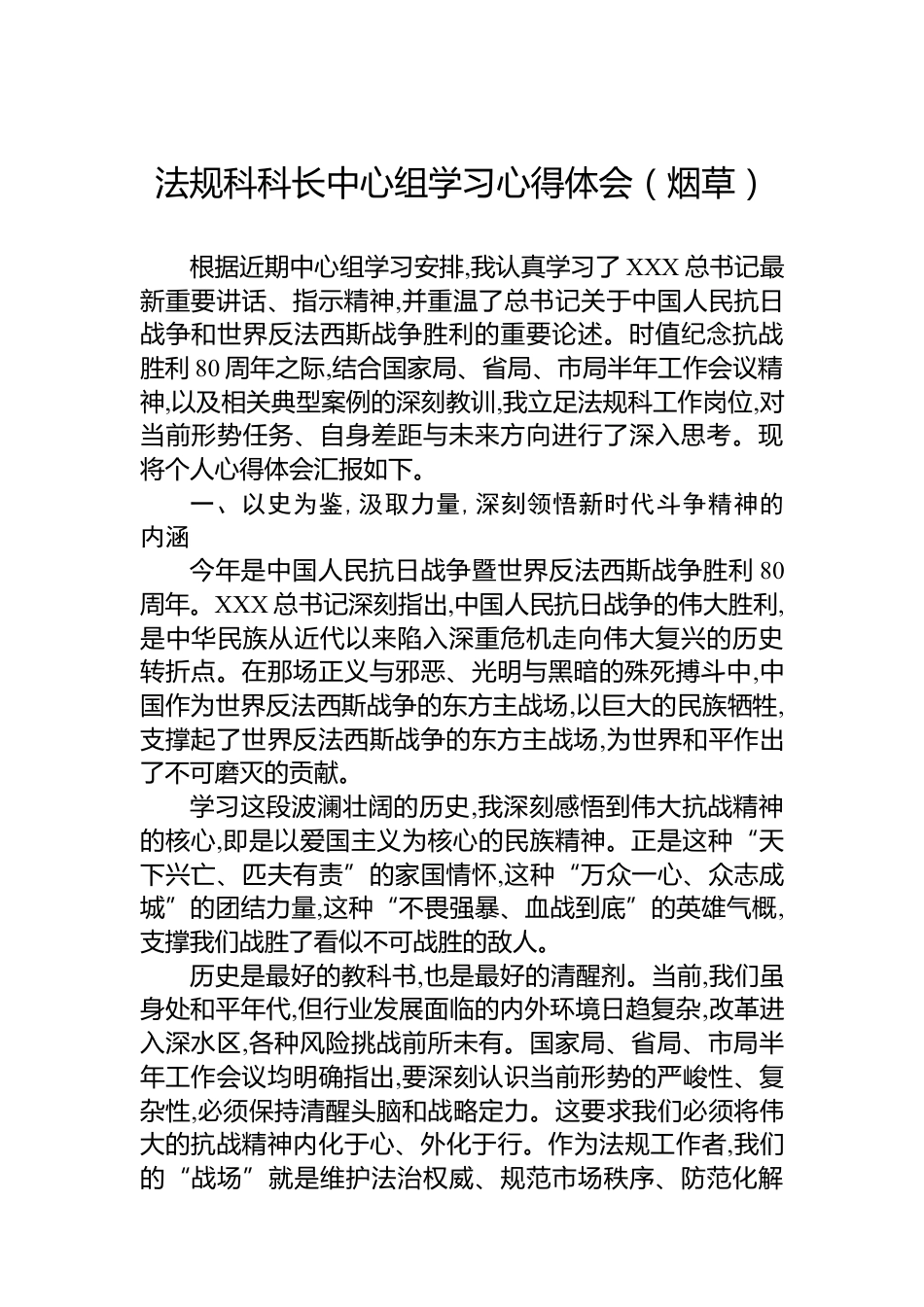 法規(guī)科科長(zhǎng)中心組學(xué)習(xí)心得體會(huì)(煙草)根據(jù)近期中心組學(xué)習(xí)安排,我認(rèn)真學(xué)習(xí)了XXX總書記最新重要講話、指示精神,并重溫了總書記關(guān)于中國(guó)人民抗日戰(zhàn)爭(zhēng)和世界反法西斯戰(zhàn)爭(zhēng)勝利的重要論述。時(shí)值紀(jì)念抗戰(zhàn)勝利80周年之際,結(jié)合國(guó)家局、省局、市局半年工作會(huì)議精神,以及相關(guān)典型案例的深刻教訓(xùn),我立足法規(guī)科工作崗位,對(duì)當(dāng)前形勢(shì)任務(wù)、自身差距與未來(lái)方向進(jìn)行了深入思考?,F(xiàn)將個(gè)人心得體會(huì)匯報(bào)如下。一、以史為鑒,汲取力量,深刻領(lǐng)悟新時(shí)代斗爭(zhēng)精神的內(nèi)涵今年是中國(guó)人民抗日戰(zhàn)爭(zhēng)暨世界反法西斯戰(zhàn)爭(zhēng)勝利80周年。XXX總書記深刻指出,中國(guó)人民抗日戰(zhàn)爭(zhēng)的偉大勝利,是中華民族從近代以來(lái)陷...