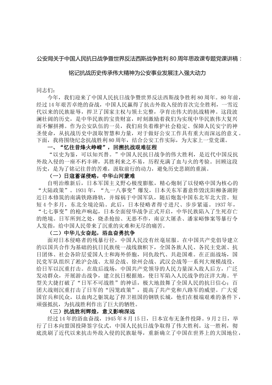 公安局關(guān)于中國(guó)人民抗日戰(zhàn)爭(zhēng)暨世界反法西斯戰(zhàn)爭(zhēng)勝利80周年思政課專(zhuān)題黨課講稿:銘記抗戰(zhàn)歷史+傳承偉大精神+為公安事業(yè)發(fā)展注入強(qiáng)大動(dòng)力
