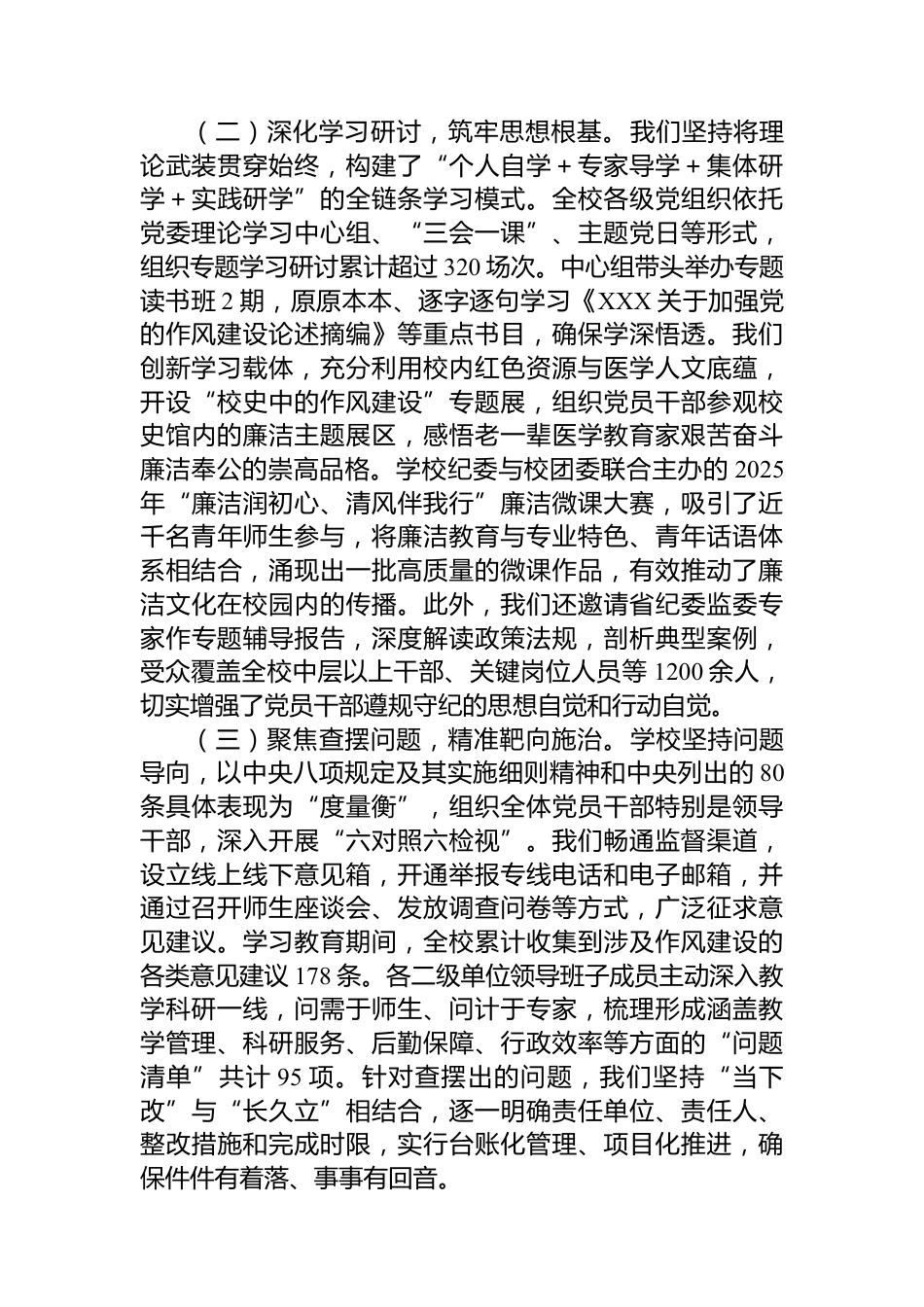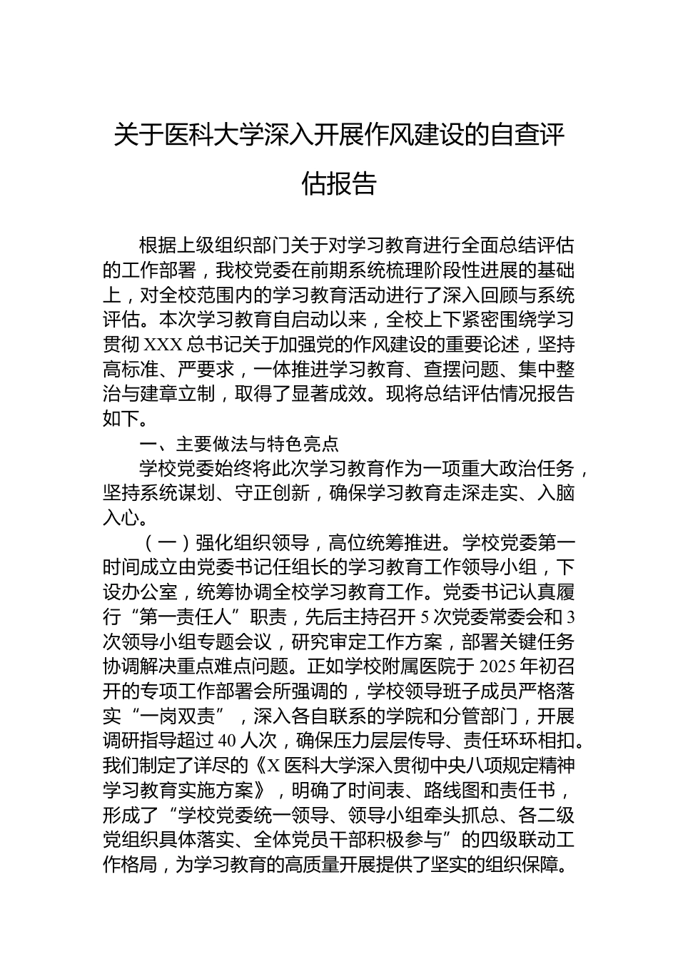 關于醫(yī)科大學深入開展作風建設的自查評估報告根據(jù)上級組織部門關于對學習教育進行全面總結評估的工作部署,我校黨委在前期系統(tǒng)梳理階段性進展的基礎上,對全校范圍內(nèi)的學習教育活動進行了深入回顧與系統(tǒng)評估。本次學習教育自啟動以來,全校上下緊密圍繞學習貫徹XXX總書記關于加強黨的作風建設的重要論述,堅持高標準、嚴要求,一體推進學習教育、查擺問題、集中整治與建章立制,取得了顯著成效?,F(xiàn)將總結評估情況報告如下。一、主要做法與特色亮點學校黨委始終將此次學習教育作為一項重大政治任務,堅持系統(tǒng)謀劃、守正創(chuàng)新,確保學習教育走深走實、入腦入心。(一)強化...