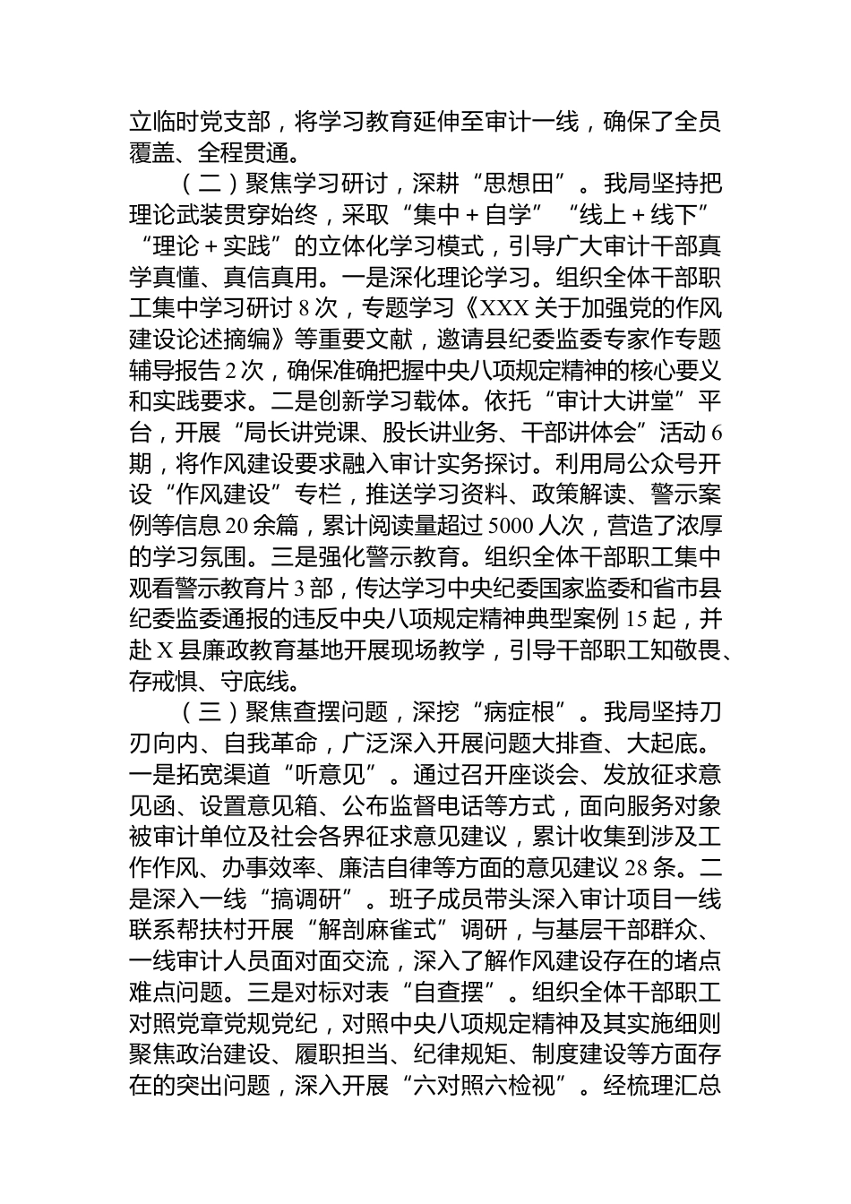 關(guān)于在縣審計(jì)局深入開(kāi)展作風(fēng)建設(shè)的自查評(píng)估報(bào)告縣審計(jì)局黨組堅(jiān)決貫徹落實(shí)黨中央決策部署和省市縣委工作要求,將此次學(xué)習(xí)教育作為一項(xiàng)重大政治任務(wù),以高度的政治自覺(jué)、思想自覺(jué)和行動(dòng)自覺(jué),精心組織、周密部署、扎實(shí)推進(jìn),確保學(xué)習(xí)教育走深走實(shí)、見(jiàn)行見(jiàn)效。全局上下以此次學(xué)習(xí)教育為契機(jī),深刻淬煉了政治品格,持續(xù)凈化了政治生態(tài),有力推動(dòng)了工作作風(fēng)的系統(tǒng)性重塑和審計(jì)事業(yè)的高質(zhì)量發(fā)展。根據(jù)縣委組織部關(guān)于對(duì)全縣貫徹落實(shí)中央八項(xiàng)規(guī)定精神學(xué)習(xí)教育進(jìn)行全面總結(jié)評(píng)估的統(tǒng)一部署,我局黨組高度重視,在前期系統(tǒng)梳理階段性進(jìn)展的基礎(chǔ)上,對(duì)學(xué)習(xí)教育的全過(guò)程、各環(huán)節(jié)進(jìn)行了...