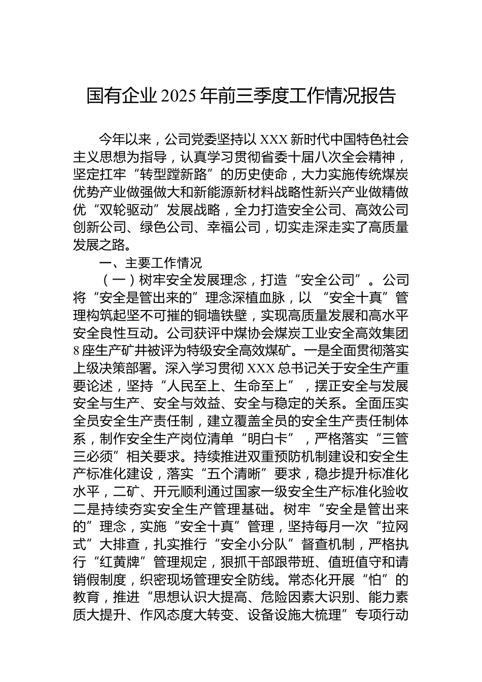 國(guó)有企業(yè)2025年前三季度工作情況報(bào)告今年以來(lái),公司黨委堅(jiān)持以XXX新時(shí)代中國(guó)特色社會(huì)主義思想為指導(dǎo),認(rèn)真學(xué)習(xí)貫徹省委十屆八次全會(huì)精神,堅(jiān)定扛牢“轉(zhuǎn)型蹚新路”的歷史使命,大力實(shí)施傳統(tǒng)煤炭?jī)?yōu)勢(shì)產(chǎn)業(yè)做強(qiáng)做大和新能源新材料戰(zhàn)略性新興產(chǎn)業(yè)做精做優(yōu)“雙輪驅(qū)動(dòng)”發(fā)展戰(zhàn)略,全力打造安全公司、高效公司創(chuàng)新公司、綠色公司、幸福公司,切實(shí)走深走實(shí)了高質(zhì)量發(fā)展之路。一、主要工作情況(一)樹(shù)牢安全發(fā)展理念,打造“安全公司”。公司將“安全是管出來(lái)的”理念深植血脈,以“安全十真”管理構(gòu)筑起堅(jiān)不可摧的銅墻鐵壁,實(shí)現(xiàn)高質(zhì)量發(fā)展和高水平安全良性互動(dòng)。公司獲評(píng)中煤協(xié)...