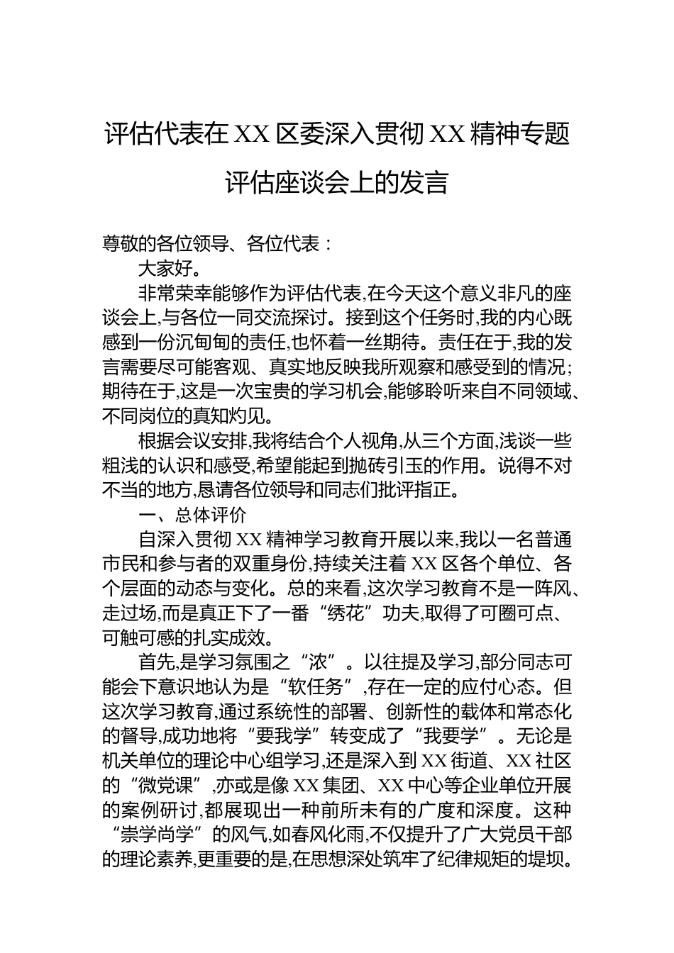 評估代表在XX區(qū)委深入貫徹XX精神專題評估座談會上的發(fā)言