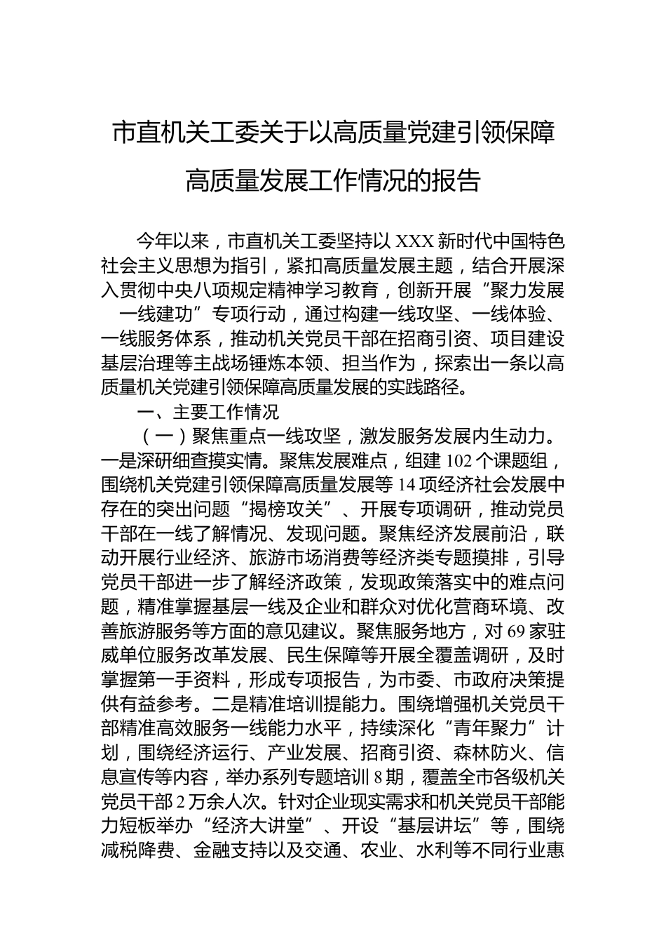市直機關(guān)工委關(guān)于以高質(zhì)量黨建引領(lǐng)保障高質(zhì)量發(fā)展工作情況的報告今年以來,市直機關(guān)工委堅持以XXX新時代中國特色社會主義思想為指引,緊扣高質(zhì)量發(fā)展主題,結(jié)合開展深入貫徹中央八項規(guī)定精神學(xué)習(xí)教育,創(chuàng)新開展“聚力發(fā)展一線建功”專項行動,通過構(gòu)建一線攻堅、一線體驗、一線服務(wù)體系,推動機關(guān)黨員干部在招商引資、項目建設(shè)基層治理等主戰(zhàn)場錘煉本領(lǐng)、擔當作為,探索出一條以高質(zhì)量機關(guān)黨建引領(lǐng)保障高質(zhì)量發(fā)展的實踐路徑。一、主要工作情況(一)聚焦重點一線攻堅,激發(fā)服務(wù)發(fā)展內(nèi)生動力。一是深研細查摸實情。聚焦發(fā)展難點,組建102個課題組,圍繞機關(guān)黨建引領(lǐng)保障高...