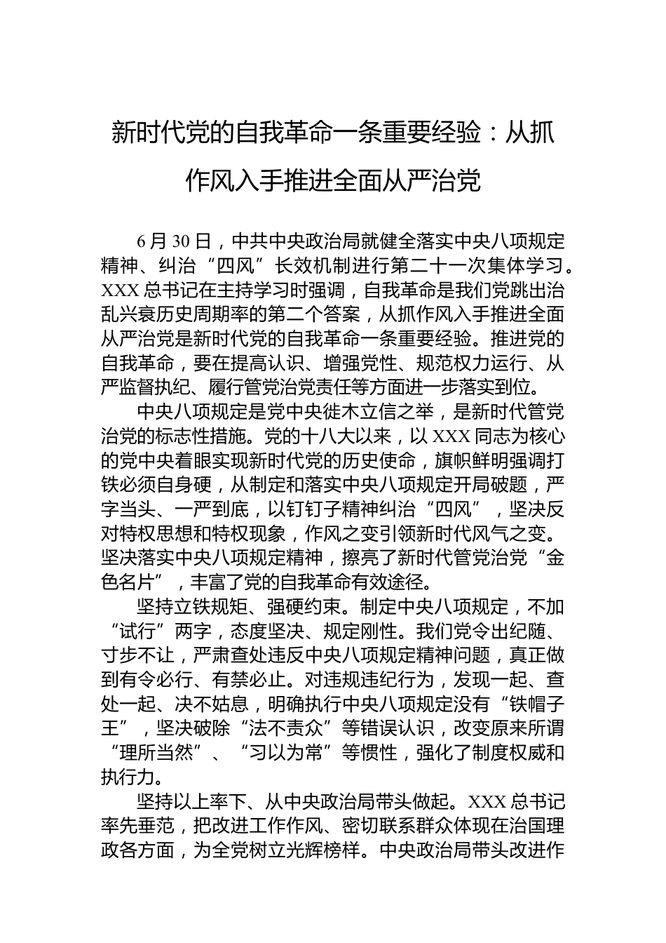 新時(shí)代黨的自我革命一條重要經(jīng)驗(yàn):從抓作風(fēng)入手推進(jìn)全面從嚴(yán)治黨6月30日,中共中央政治局就健全落實(shí)中央八項(xiàng)規(guī)定精神、糾治“四風(fēng)”長(zhǎng)效機(jī)制進(jìn)行第二十一次集體學(xué)習(xí)。XXX總書記在主持學(xué)習(xí)時(shí)強(qiáng)調(diào),自我革命是我們黨跳出治亂興衰歷史周期率的第二個(gè)答案,從抓作風(fēng)入手推進(jìn)全面從嚴(yán)治黨是新時(shí)代黨的自我革命一條重要經(jīng)驗(yàn)。推進(jìn)黨的自我革命,要在提高認(rèn)識(shí)、增強(qiáng)黨性、規(guī)范權(quán)力運(yùn)行、從嚴(yán)監(jiān)督執(zhí)紀(jì)、履行管黨治黨責(zé)任等方面進(jìn)一步落實(shí)到位。中央八項(xiàng)規(guī)定是黨中央徙木立信之舉,是新時(shí)代管黨治黨的標(biāo)志性措施。黨的十八大以來,以XXX同志為核心的黨中央著眼實(shí)現(xiàn)新時(shí)代黨的歷史...