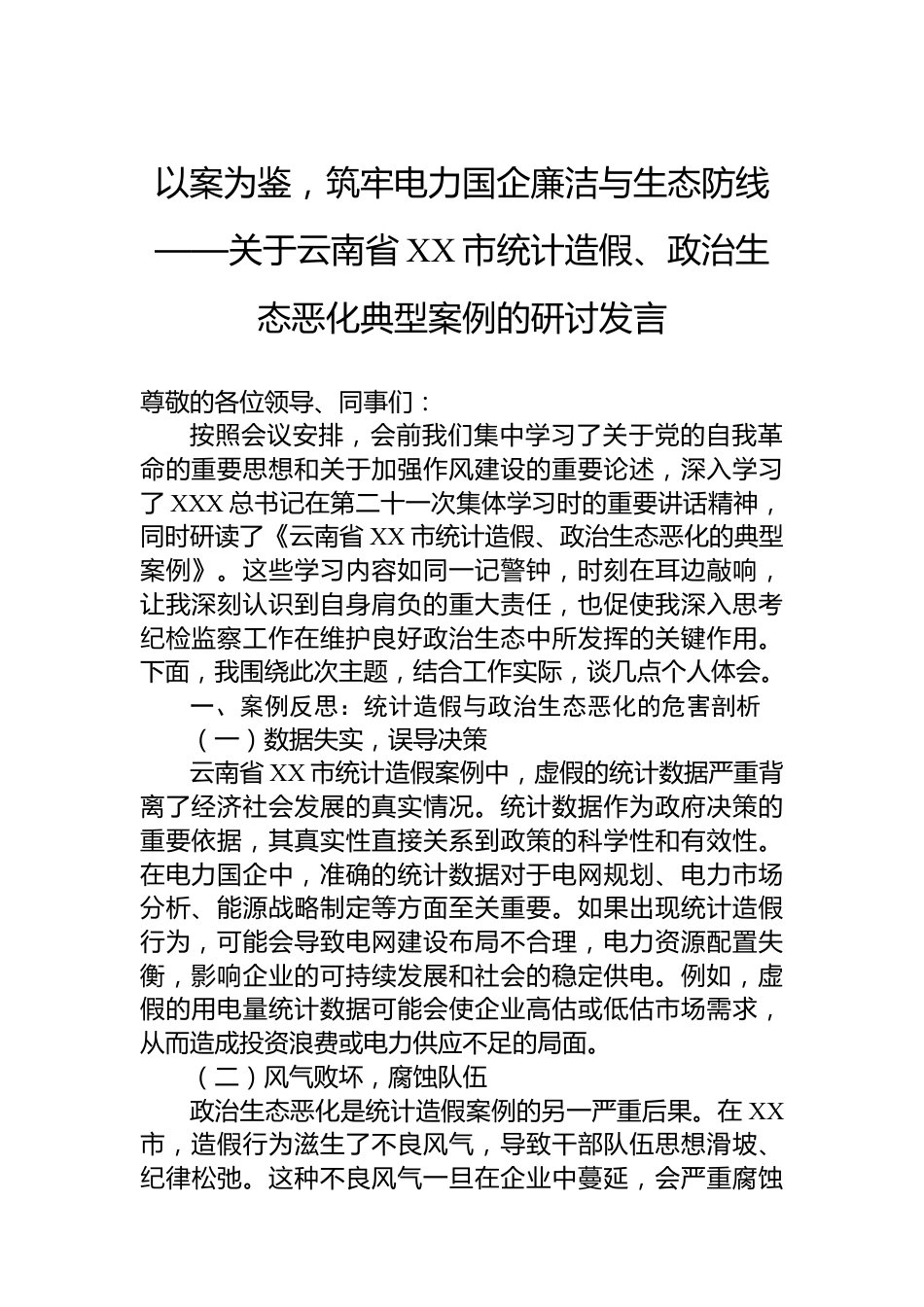 以案為鑒,筑牢電力國(guó)企廉潔與生態(tài)防線——關(guān)于云南省XX市統(tǒng)計(jì)造假、政治生態(tài)惡化典型案例的研討發(fā)言尊敬的各位領(lǐng)導(dǎo)、同事們:按照會(huì)議安排,會(huì)前我們集中學(xué)習(xí)了關(guān)于黨的自我革命的重要思想和關(guān)于加強(qiáng)作風(fēng)建設(shè)的重要論述,深入學(xué)習(xí)了XXX總書記在第二十一次集體學(xué)習(xí)時(shí)的重要講話精神,同時(shí)研讀了《云南省XX市統(tǒng)計(jì)造假、政治生態(tài)惡化的典型案例》。這些學(xué)習(xí)內(nèi)容如同一記警鐘,時(shí)刻在耳邊敲響,讓我深刻認(rèn)識(shí)到自身肩負(fù)的重大責(zé)任,也促使我深入思考紀(jì)檢監(jiān)察工作在維護(hù)良好政治生態(tài)中所發(fā)揮的關(guān)鍵作用。下面,我圍繞此次主題,結(jié)合工作實(shí)際,談幾點(diǎn)個(gè)人體會(huì)。一、案例反思:...