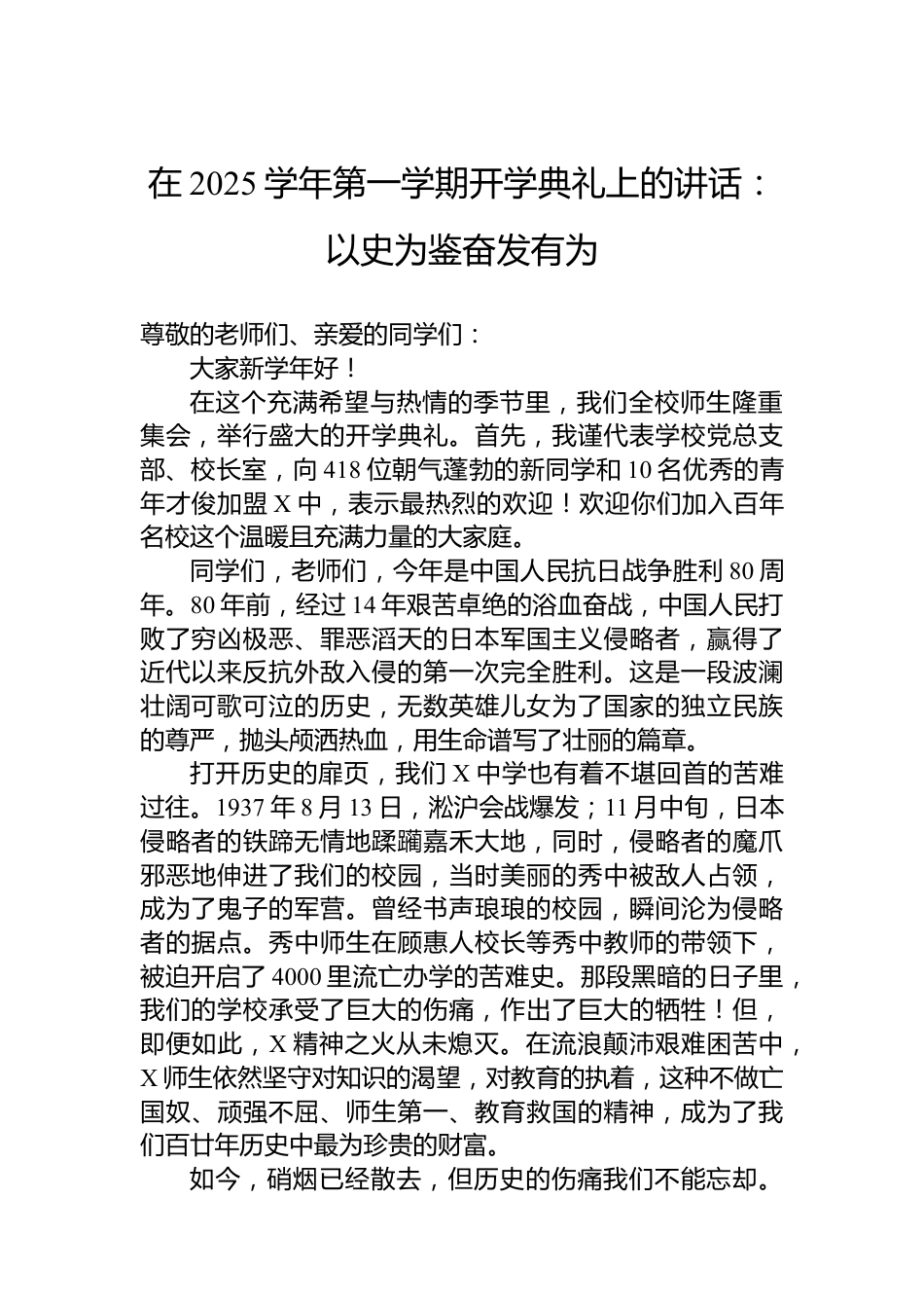 在2025學(xué)年第一學(xué)期開學(xué)典禮上的講話:以史為鑒奮發(fā)有為尊敬的老師們、親愛的同學(xué)們:大家新學(xué)年好!在這個充滿希望與熱情的季節(jié)里,我們?nèi)熒≈丶瘯?,舉行盛大的開學(xué)典禮。首先,我謹(jǐn)代表學(xué)校黨總支部、校長室,向418位朝氣蓬勃的新同學(xué)和10名優(yōu)秀的青年才俊加盟X中,表示最熱烈的歡迎!歡迎你們加入百年名校這個溫暖且充滿力量的大家庭。同學(xué)們,老師們,今年是中國人民抗日戰(zhàn)爭勝利80周年。80年前,經(jīng)過14年艱苦卓絕的浴血奮戰(zhàn),中國人民打敗了窮兇極惡、罪惡滔天的日本軍國主義侵略者,贏得了近代以來反抗外敵入侵的第一次完全勝利。這是一段波瀾壯闊可歌可泣的...