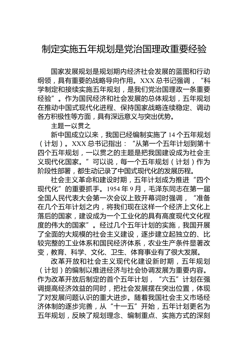 制定實施五年規(guī)劃是黨治國理政重要經(jīng)驗國家發(fā)展規(guī)劃是規(guī)劃期內(nèi)經(jīng)濟社會發(fā)展的藍圖和行動綱領(lǐng),具有重要的戰(zhàn)略導(dǎo)向作用。XXX總書記強調(diào),“科學(xué)制定和接續(xù)實施五年規(guī)劃,是我們黨治國理政一條重要經(jīng)驗”。作為國民經(jīng)濟和社會發(fā)展的總體規(guī)劃,五年規(guī)劃在推動中國式現(xiàn)代化進程、保持國家戰(zhàn)略連續(xù)穩(wěn)定、調(diào)動各方積極性等方面,具有深遠意義與突出優(yōu)勢。主題一以貫之新中國成立以來,我國已經(jīng)編制實施了14個五年規(guī)劃(計劃)。XXX總書記指出:“從第一個五年計劃到第十四個五年規(guī)劃,一以貫之的主題是把我國建設(shè)成為社會主義現(xiàn)代化國家。”可以說,每一個五年規(guī)劃(計劃)作為...