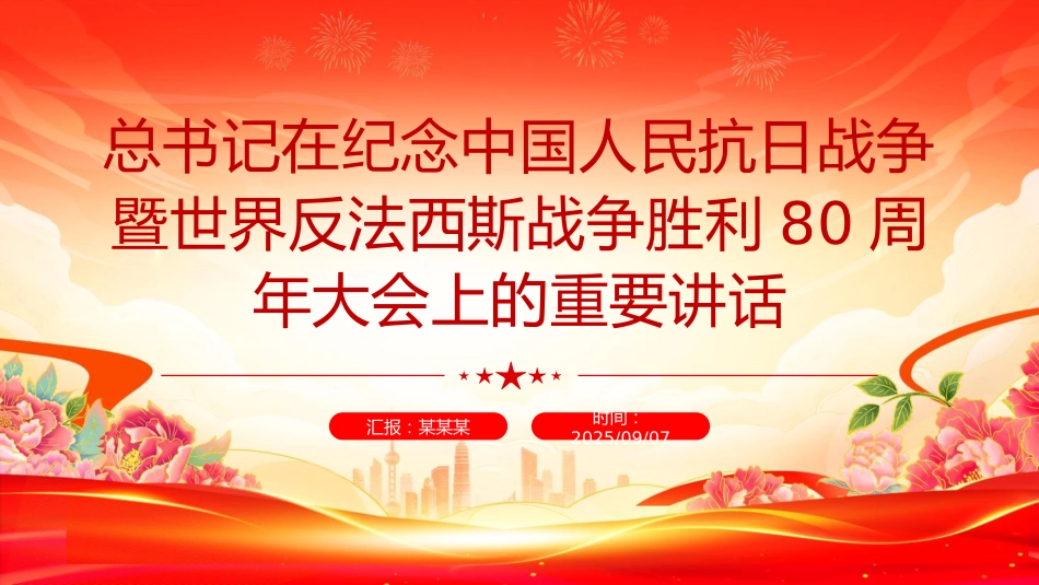匯報:某某某時間:2025/09/07總書記在紀念中國人民抗日戰(zhàn)爭暨世界反法西斯戰(zhàn)爭勝利80周年大會上的重要講話全國同胞們,尊敬的各位國家元首、政府首腦和國際組織代表,尊敬的各位來賓,全體受閱將士們,同志們、朋友們:今天,我們隆重集會,紀念中國人民抗日戰(zhàn)爭暨世界反法西斯戰(zhàn)爭勝利80周年,共同銘記歷史、緬懷先烈、珍愛和平、開創(chuàng)未來。紀念中國人民抗日戰(zhàn)爭暨世界反法西斯戰(zhàn)爭勝利80周年我代表中共中央、全國人大、國務(wù)院、全國政協(xié)、中央軍委,向全國參加過抗日戰(zhàn)爭的老戰(zhàn)士、老同志、愛國人士和抗日將領(lǐng),向為中國人民抗日戰(zhàn)爭勝利作出重大貢獻的海內(nèi)外中華兒女...