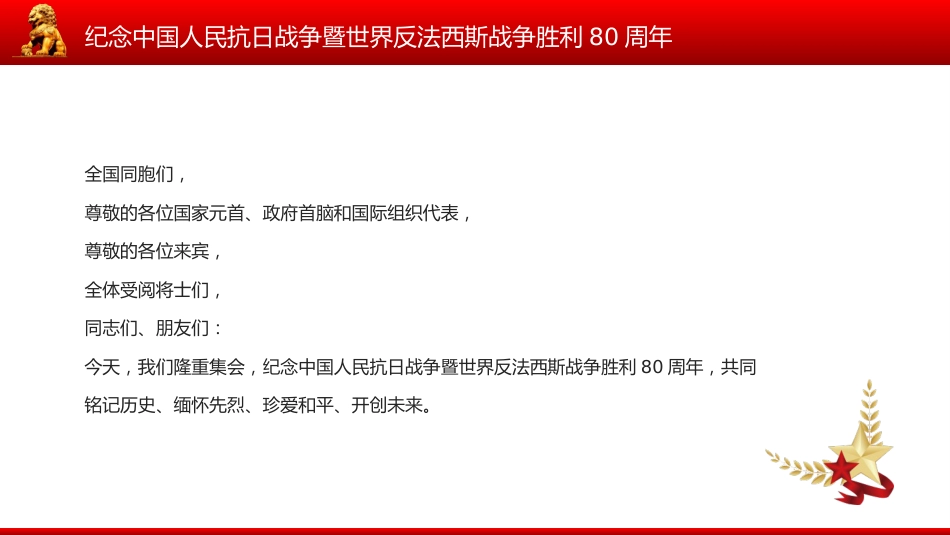 總書記在紀念中國人民抗日戰(zhàn)爭暨世界反法西斯戰(zhàn)爭勝利80周年大會上的重要講話PPT課件(帶講稿)