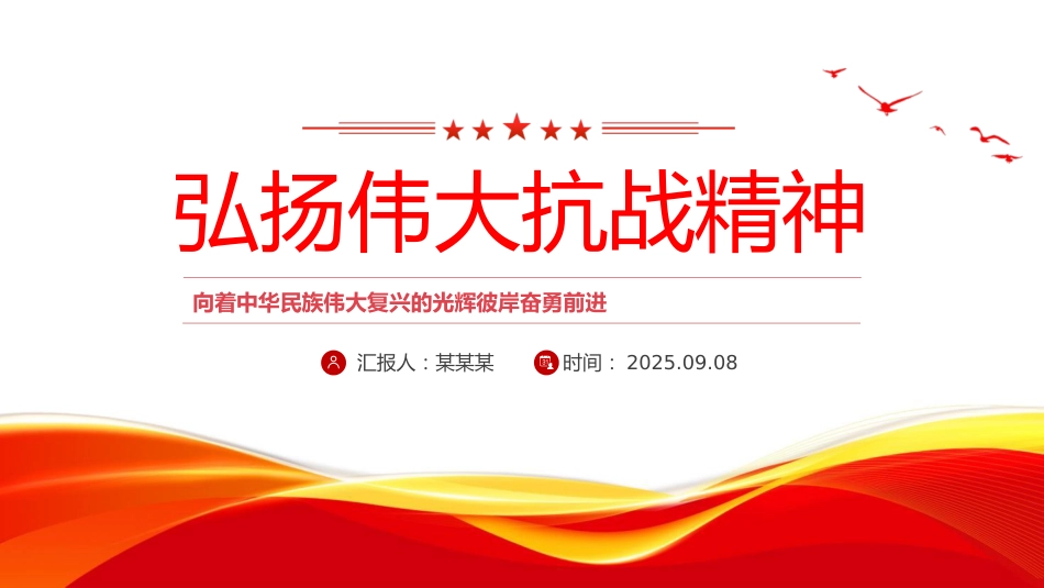 匯報(bào)人:某某某時(shí)間:2025.09.08弘揚(yáng)偉大抗戰(zhàn)精神向著中華民族偉大復(fù)興的光輝彼岸奮勇前進(jìn)(2014年7月7日在紀(jì)念全民族抗戰(zhàn)爆發(fā)77周年儀式上的講話)偉大的中國(guó)人民抗日戰(zhàn)爭(zhēng),是中國(guó)人民近代以來爭(zhēng)取獨(dú)立自由史冊(cè)上可歌可泣的一頁(yè),是中華民族歷史發(fā)展進(jìn)程中飽經(jīng)滄桑的一章。偉大的中國(guó)人民抗日戰(zhàn)爭(zhēng),使中華民族的覺醒和團(tuán)結(jié)達(dá)到了前所未有的高度。正如毛澤東同志所指出的,這是“戰(zhàn)爭(zhēng)史上的奇觀,中華民族的壯舉,驚天動(dòng)地的偉業(yè)”。偉大的中國(guó)人民抗日戰(zhàn)爭(zhēng),開辟了世界反法西斯戰(zhàn)爭(zhēng)的東方主戰(zhàn)場(chǎng),為挽救民族危亡、實(shí)現(xiàn)民族獨(dú)立和人民解放,為爭(zhēng)取世界和平的偉大事業(yè),作...