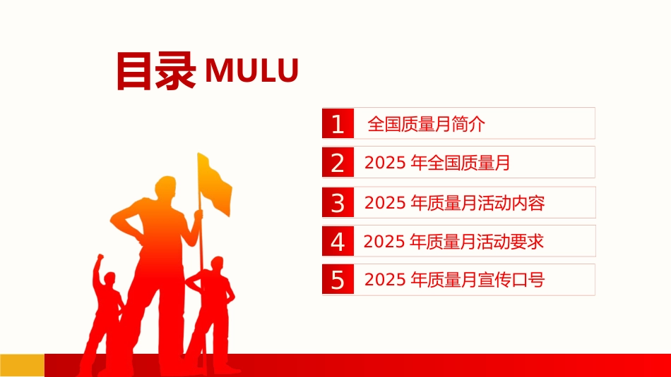 2025年全國質量月匯報人:某某某——加強全面質量管理促進質量強國建設——目錄MULU22025年全國質量月32025年質量月活動內(nèi)容42025年質量月活動要求52025年質量月宣傳口號1全國質量月簡介全國質量月簡介第一部分全國質量月簡介2025年全國質量月質量月(QualityMonth)是指在國家質量工作主管部門的倡導和部署下,由全社會尤其是廣大企業(yè)積極參與、旨在提高全民族質量意識、提高質量的一年一度的專題活動什么是質量月?全國質量月簡介2025年全國質量月活動背景我國的質量月活動始于1978年。?當時正值十年浩劫后我國國民經(jīng)濟開始恢復初期,許多企業(yè)生產(chǎn)效率低、質量問題嚴...