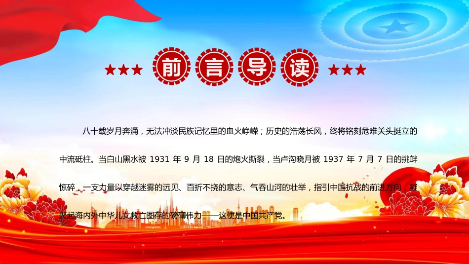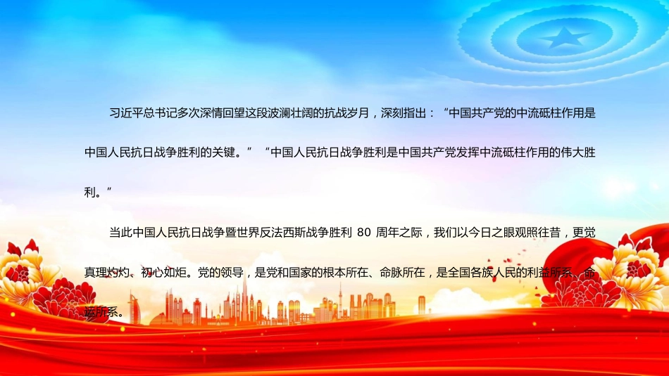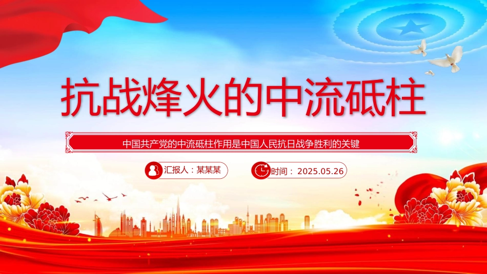 中國共產(chǎn)黨的中流砥柱作用是中國人民抗日戰(zhàn)爭勝利的關(guān)鍵匯報人:某某某時間:2025.05.26抗戰(zhàn)烽火的中流砥柱前言導(dǎo)讀八十載歲月奔涌,無法沖淡民族記憶里的血火崢嶸;歷史的浩蕩長風(fēng),終將銘刻危難關(guān)頭挺立的中流砥柱。當(dāng)白山黑水被1931年9月18日的炮火撕裂,當(dāng)盧溝曉月被1937年7月7日的挑釁驚碎,一支力量以穿越迷霧的遠(yuǎn)見、百折不撓的意志、氣吞山河的壯舉,指引中國抗戰(zhàn)的前進(jìn)方向,凝聚起海內(nèi)外中華兒女救亡圖存的磅礴偉力——這便是中國共產(chǎn)黨。習(xí)近平總書記多次深情回望這段波瀾壯闊的抗戰(zhàn)歲月,深刻指出:“中國共產(chǎn)黨的中流砥柱作用是中國人民抗日戰(zhàn)爭勝利的關(guān)鍵...