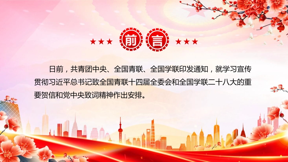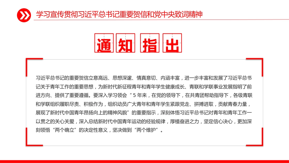 學(xué)習(xí)宣傳貫徹習(xí)近平總書記重要賀信和黨中央致詞精神匯報人:某某某時間:2025.09.04日前,共青團(tuán)中央、全國青聯(lián)、全國學(xué)聯(lián)印發(fā)通知,就學(xué)習(xí)宣傳貫徹習(xí)近平總書記致全國青聯(lián)十四屆全委會和全國學(xué)聯(lián)二十八大的重要賀信和黨中央致詞精神作出安排。前言學(xué)習(xí)宣傳貫徹習(xí)近平總書記重要賀信和黨中央致詞精神通知指出習(xí)近平總書記的重要賀信立意高遠(yuǎn)、思想深邃、情真意切、內(nèi)涵豐富,進(jìn)一步豐富和發(fā)展了習(xí)近平總書記關(guān)于青年工作的重要思想,為新時代新征程青年和青年學(xué)生健康成長、青聯(lián)和學(xué)聯(lián)事業(yè)發(fā)展指明了前進(jìn)方向、提供了重要遵循。要深入學(xué)習(xí)領(lǐng)會“5年來,在黨的領(lǐng)導(dǎo)下,在...