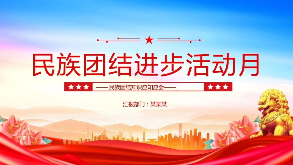 民族團結(jié)進步活動月匯報部門:某某某——民族團結(jié)知識應(yīng)知應(yīng)會——01基本知識基本知識一個堅定:堅定不移走中國特色解決民族問題正確道路兩個共同:各民族共同團結(jié)奮斗、共同繁榮發(fā)展三個離不開:漢族離不開少數(shù)民族、少數(shù)民族離不開漢族、各少數(shù)民族之間也相互離不開。四個人人:人人都有民族團結(jié)的思想,人人都說有利于民族團結(jié)的話,人人都做民族團結(jié)的好事,人人都爭當(dāng)民族團結(jié)的模范。一條主線:鑄牢中華民族共同體意識基本知識五個認(rèn)同:不斷增強各民族對偉大祖國的認(rèn)同、對中華民族的認(rèn)同、對中華文化的認(rèn)同、對中國共產(chǎn)黨的認(rèn)同、對中國特色社會主義的認(rèn)同。五個...