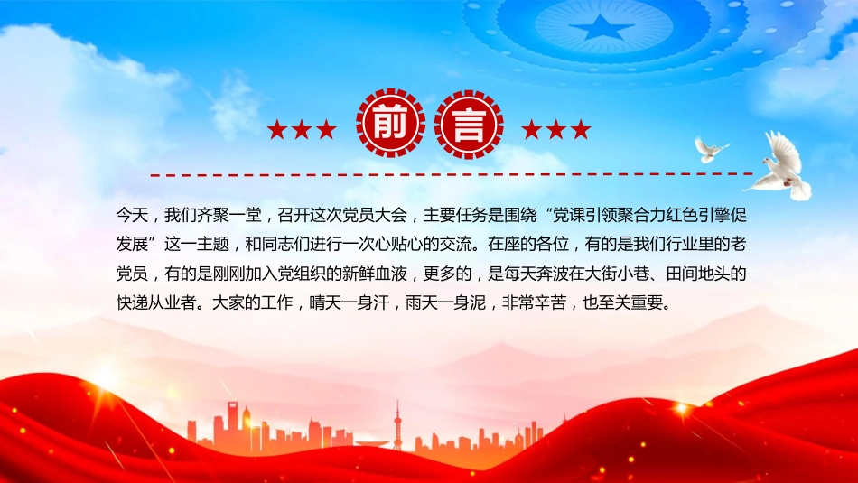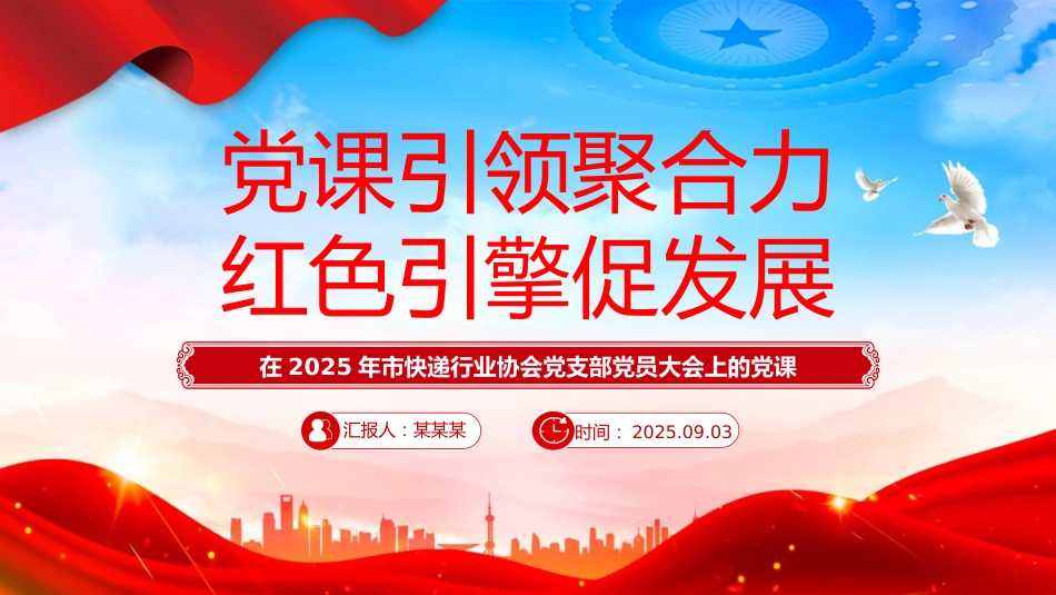 匯報(bào)人:某某某時(shí)間:2025.09.03黨課引領(lǐng)聚合力紅色引擎促發(fā)展在2025年市快遞行業(yè)協(xié)會(huì)黨支部黨員大會(huì)上的黨課今天,我們齊聚一堂,召開這次黨員大會(huì),主要任務(wù)是圍繞“黨課引領(lǐng)聚合力紅色引擎促發(fā)展”這一主題,和同志們進(jìn)行一次心貼心的交流。在座的各位,有的是我們行業(yè)里的老黨員,有的是剛剛加入黨組織的新鮮血液,更多的,是每天奔波在大街小巷、田間地頭的快遞從業(yè)者。大家的工作,晴天一身汗,雨天一身泥,非常辛苦,也至關(guān)重要。前言快遞行業(yè)聽起來好像離高深的理論很遠(yuǎn),每天就是收件、派件,但我要說,咱們這個(gè)行業(yè),恰恰是時(shí)代發(fā)展的縮影,是經(jīng)濟(jì)脈動(dòng)的神經(jīng)末...