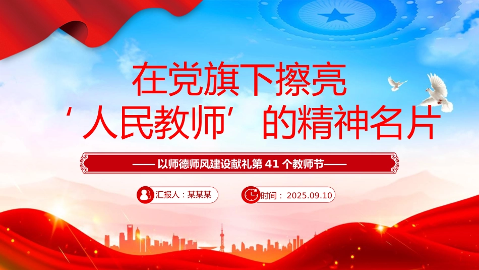 匯報(bào)人:某某某時(shí)間:2025.09.10——以師德師風(fēng)建設(shè)獻(xiàn)禮第41個(gè)教師節(jié)——在黨旗下擦亮‘人民教師’的精神名片當(dāng)九月的金風(fēng)再一次吹亮校園的銀杏,我們也迎來(lái)了屬于自己的節(jié)日——教師節(jié)。今天,我們把黨課搬到教師節(jié)當(dāng)天,既是以黨的名義向全體人民教師致敬,也是再一次在黨旗下追問(wèn):教師之“師”,究竟意味著什么?我們?yōu)楹卧凇皫煛弊智肮谝浴叭嗣瘛保吭诿褡鍙?fù)興的新征程上,今天的教師當(dāng)以怎樣的精神長(zhǎng)相,托舉明天的中國(guó)?我今天的黨課主題是:“在黨旗下擦亮‘人民教師’的精神名片——以師德師風(fēng)建設(shè)獻(xiàn)禮第41個(gè)教師節(jié)”。圍繞主題,我將按照"三重叩問(wèn)、三重淬煉、...