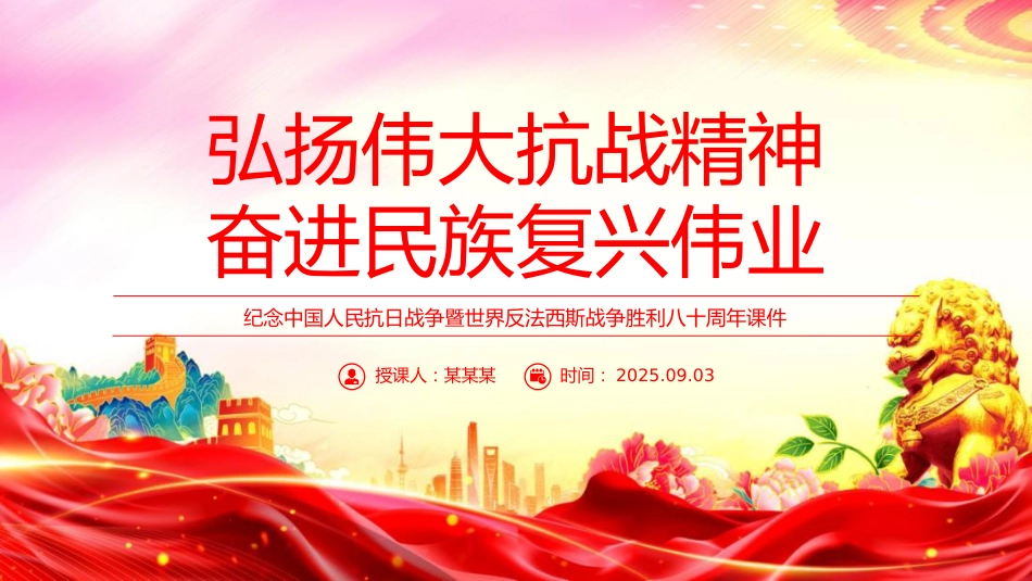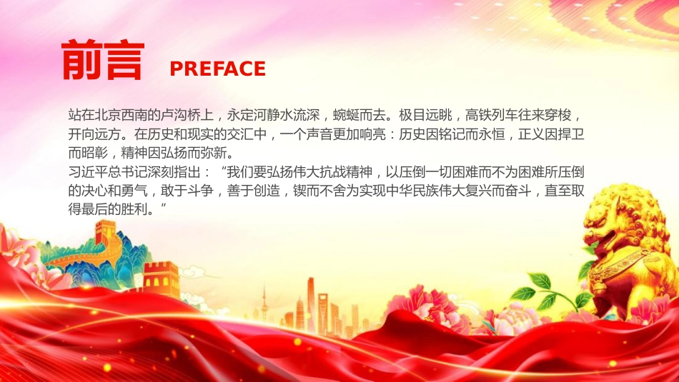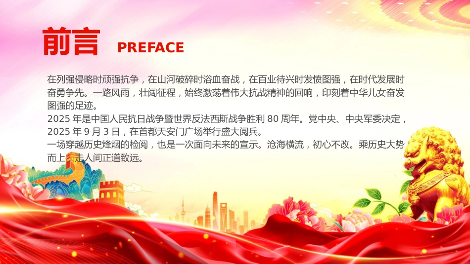 授課人:某某某時間:2025.09.03弘揚(yáng)偉大抗戰(zhàn)精神奮進(jìn)民族復(fù)興偉業(yè)紀(jì)念中國人民抗日戰(zhàn)爭暨世界反法西斯戰(zhàn)爭勝利八十周年課件前言PREFACE站在北京西南的盧溝橋上,永定河靜水流深,蜿蜒而去。極目遠(yuǎn)眺,高鐵列車往來穿梭,開向遠(yuǎn)方。在歷史和現(xiàn)實(shí)的交匯中,一個聲音更加響亮:歷史因銘記而永恒,正義因捍衛(wèi)而昭彰,精神因弘揚(yáng)而彌新。習(xí)近平總書記深刻指出:“我們要弘揚(yáng)偉大抗戰(zhàn)精神,以壓倒一切困難而不為困難所壓倒的決心和勇氣,敢于斗爭,善于創(chuàng)造,鍥而不舍為實(shí)現(xiàn)中華民族偉大復(fù)興而奮斗,直至取得最后的勝利。”前言PREFACE在列強(qiáng)侵略時頑強(qiáng)抗?fàn)?,在山河破碎時浴血...