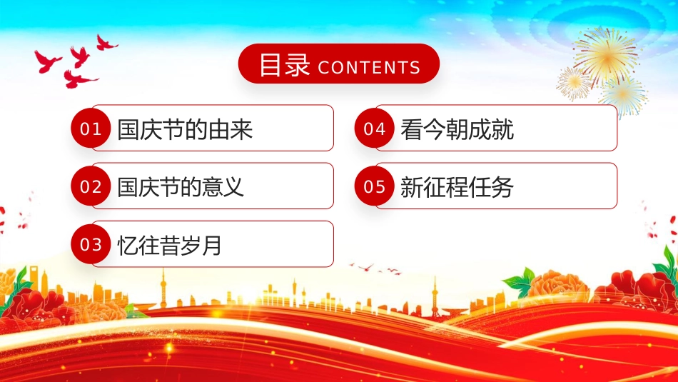 匯報(bào)人:某某某時(shí)間:2025.09.09熱烈慶祝周年NEWCHINAWASFOUNDED重溫歷史榮耀,展望未來輝煌76新中國成立新中國成立國慶節(jié)的由來01國慶節(jié)的意義02看今朝成就04新征程任務(wù)05目錄CONTENTS憶往昔歲月03又是一年好景至,我們迎來了中華人民共和國成立74周年華誕每個(gè)人的臉上都寫滿了對祖國繁榮昌盛的自信與祝福,每個(gè)人的手上都揮舞著“愛國”的紅色旗幟國慶節(jié)由來PART011949年10月1日1949年10月1日,中華人民共和國中央人民政府成立典禮,即開國盛典,在北京天安門廣場隆重舉行。國慶節(jié)由來1949年10月9日中國人民政治協(xié)商會議第一屆全國委員會召開第一次會議。許廣平委員發(fā)...