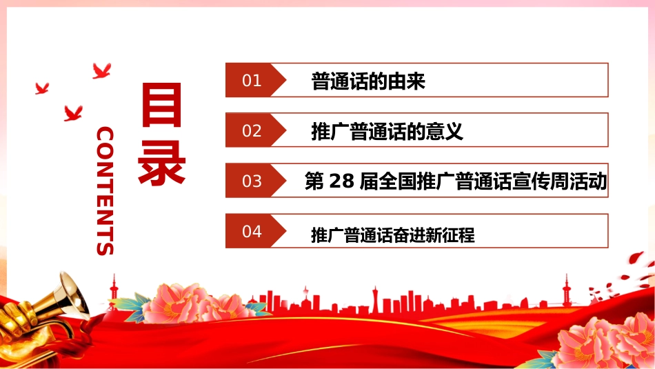 匯報人:某某某加大國家通用語言文字推廣力度,促進(jìn)鑄牢中華民族共同體意識全國推廣普通話宣傳周2025年第28屆推普周說普通話寫規(guī)范字做文明人用禮貌語目錄CONTENTS01020304普通話的由來推廣普通話的意義第28屆全國推廣普通話宣傳周活動推廣普通話奮進(jìn)新征程第一章普通話的由來?普通話的由來普通話的由來為了便于不同地域的人們更好地溝通。我國是一個地形復(fù)雜、高山林立、河流縱橫的國家,十里不同音,五里不同言,僅漢族的方言區(qū)就多達(dá)十幾個,少數(shù)民族更有五十多個。過去交通欠發(fā)達(dá),人們多停留于本地,同是鄉(xiāng)親和鄉(xiāng)音,彼此交流溝通不會產(chǎn)生歧義或誤解。普通話?普通...