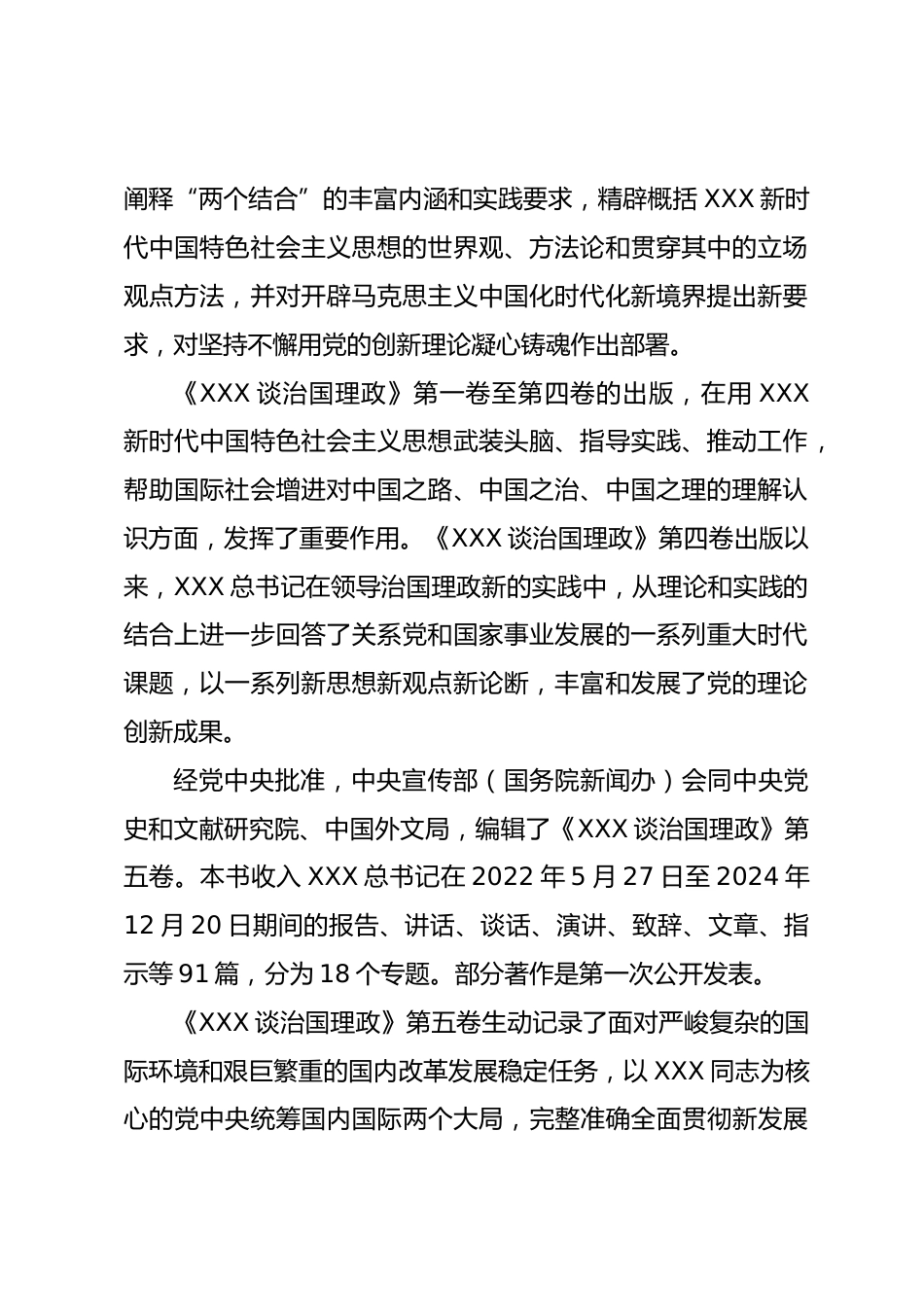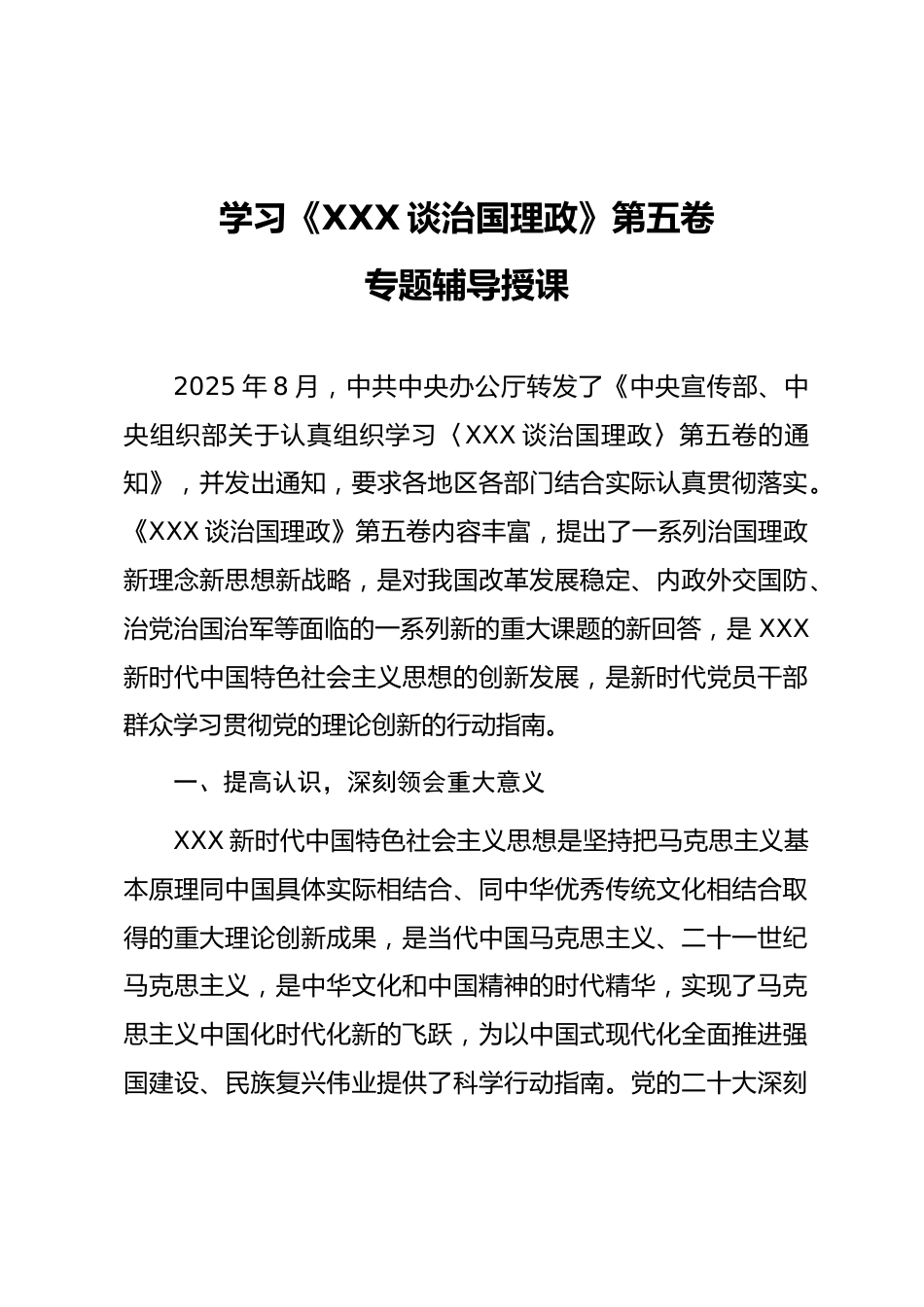 學(xué)習(xí)《XXX談治國理政》第五卷專題輔導(dǎo)授課2025年8月,中共中央辦公廳轉(zhuǎn)發(fā)了《中央宣傳部、中央組織部關(guān)于認(rèn)真組織學(xué)習(xí)〈XXX談治國理政〉第五卷的通知》,并發(fā)出通知,要求各地區(qū)各部門結(jié)合實際認(rèn)真貫徹落實?!禭XX談治國理政》第五卷內(nèi)容豐富,提出了一系列治國理政新理念新思想新戰(zhàn)略,是對我國改革發(fā)展穩(wěn)定、內(nèi)政外交國防、治黨治國治軍等面臨的一系列新的重大課題的新回答,是XXX新時代中國特色社會主義思想的創(chuàng)新發(fā)展,是新時代黨員干部群眾學(xué)習(xí)貫徹黨的理論創(chuàng)新的行動指南。一、提高認(rèn)識,深刻領(lǐng)會重大意義XXX新時代中國特色社會主義思想是堅持把馬克思主義基本原理...