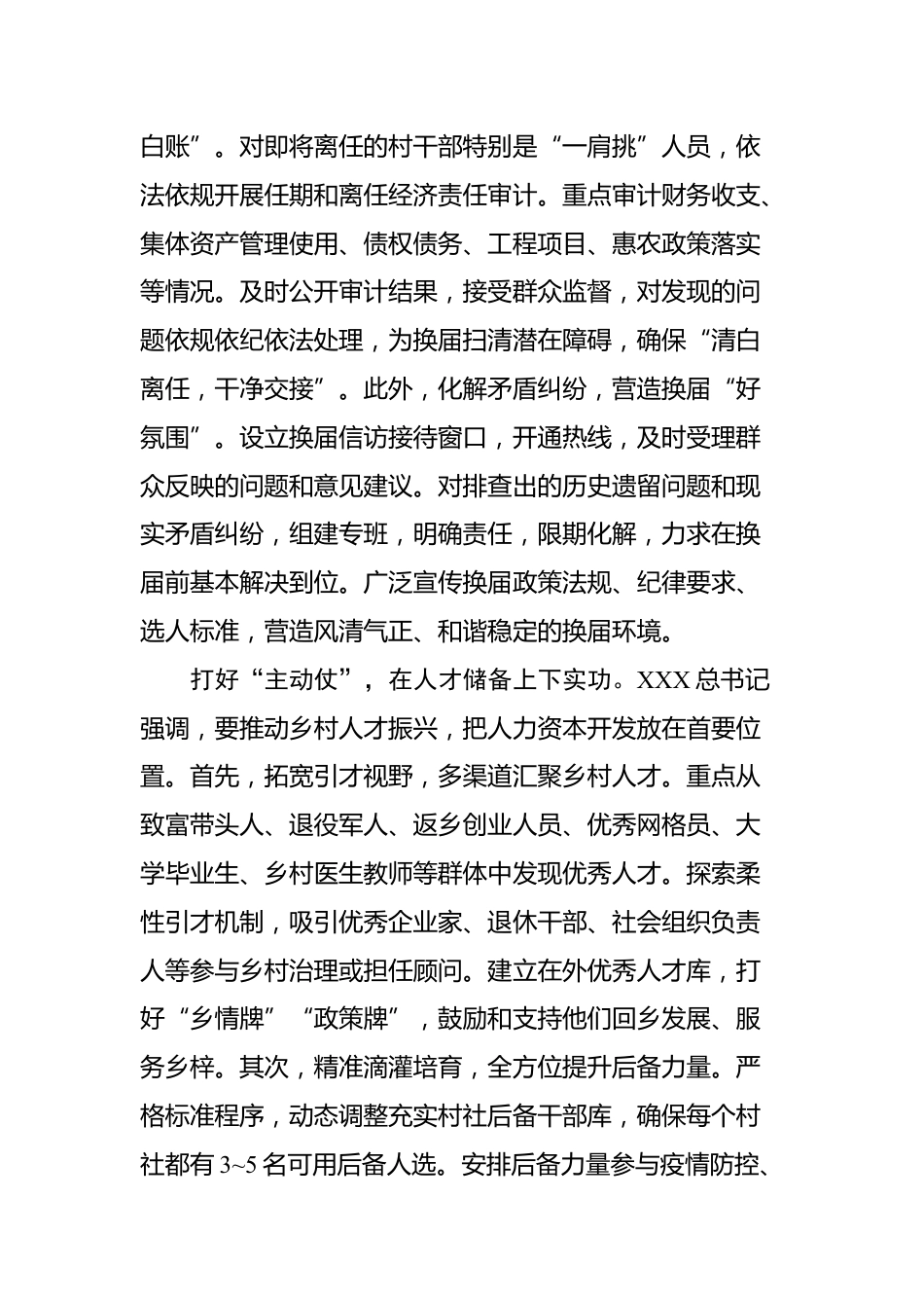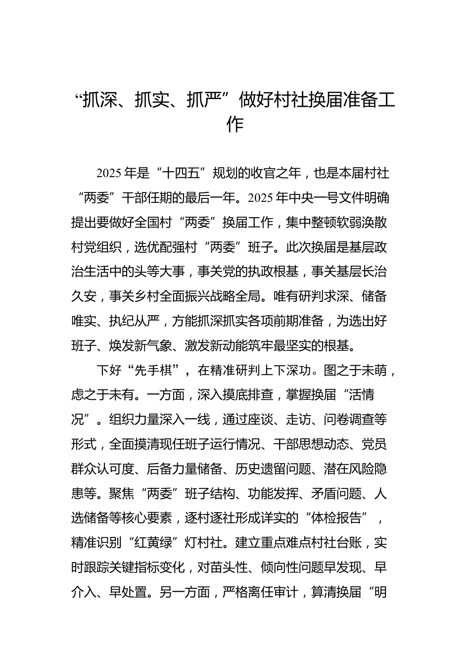 基層換屆文稿匯編(10篇)(202508)目錄1.“抓深、抓實(shí)、抓嚴(yán)”做好村社換屆準(zhǔn)備工作..........22.答好選育“全”字卷鍛造基層治理生力軍...............63.打好村級(jí)換屆“前哨戰(zhàn)”............................................94.打好村級(jí)換屆“提前量”..........................................125.講全講活講透讓農(nóng)村換屆宣講深入人心.................156.謀定于先下好村級(jí)換屆“先手棋”.........................197.念好換屆“嚴(yán)”字訣配強(qiáng)鄉(xiāng)村振興“領(lǐng)頭雁”.....228.守紀(jì)、執(zhí)紀(jì)、守紀(jì)拉好農(nóng)村換屆“紀(jì)律線”.........259.下好換屆“先手棋”譜寫鄉(xiāng)村振興新...