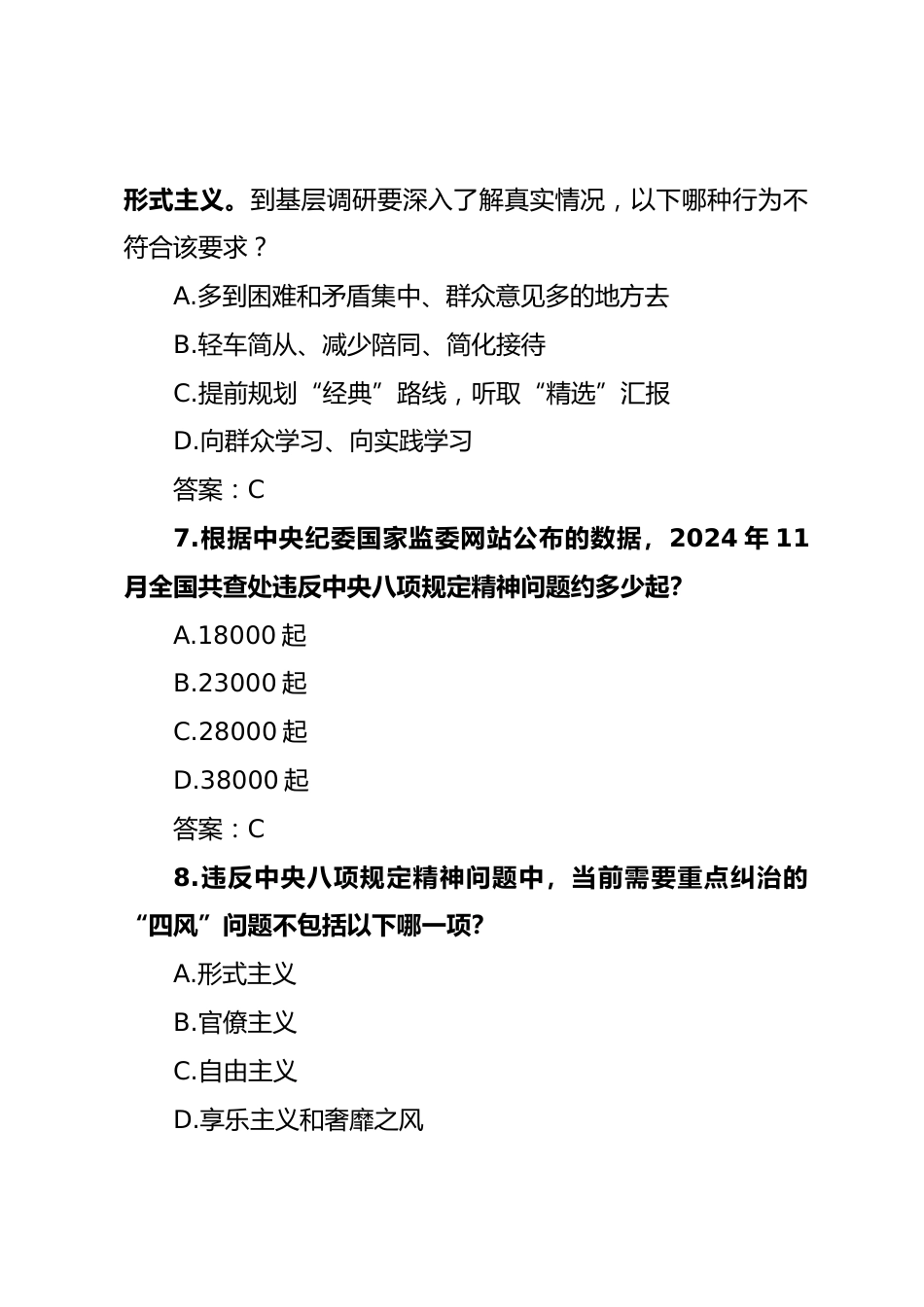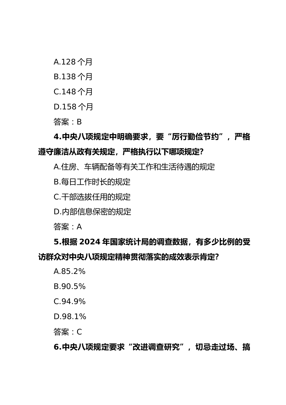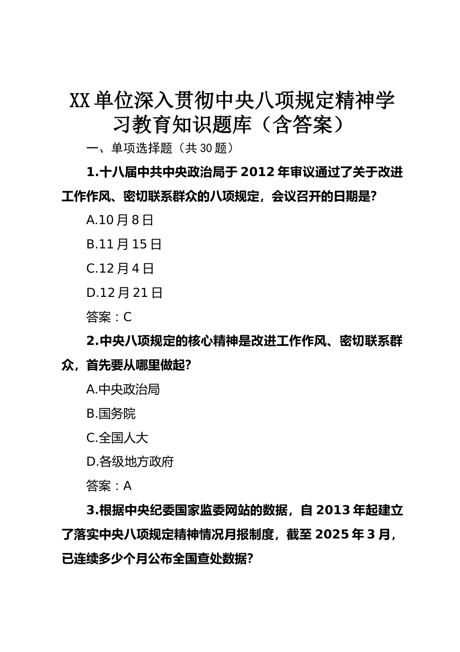 XX單位深入貫徹中央八項規(guī)定精神學(xué)習(xí)教育知識題庫(含答案)一、單項選擇題(共30題)1.十八屆中共中央政治局于2012年審議通過了關(guān)于改進工作作風(fēng)、密切聯(lián)系群眾的八項規(guī)定,會議召開的日期是?A.10月8日B.11月15日C.12月4日D.12月21日答案:C2.中央八項規(guī)定的核心精神是改進工作作風(fēng)、密切聯(lián)系群眾,首先要從哪里做起?A.中央政治局B.國務(wù)院C.全國人大D.各級地方政府答案:A3.根據(jù)中央紀委國家監(jiān)委網(wǎng)站的數(shù)據(jù),自2013年起建立了落實中央八項規(guī)定精神情況月報制度,截至2025年3月,已連續(xù)多少個月公布全國查處數(shù)據(jù)?A.128個月B.138個月C.148個月D.158個月答案:B4.中央八...