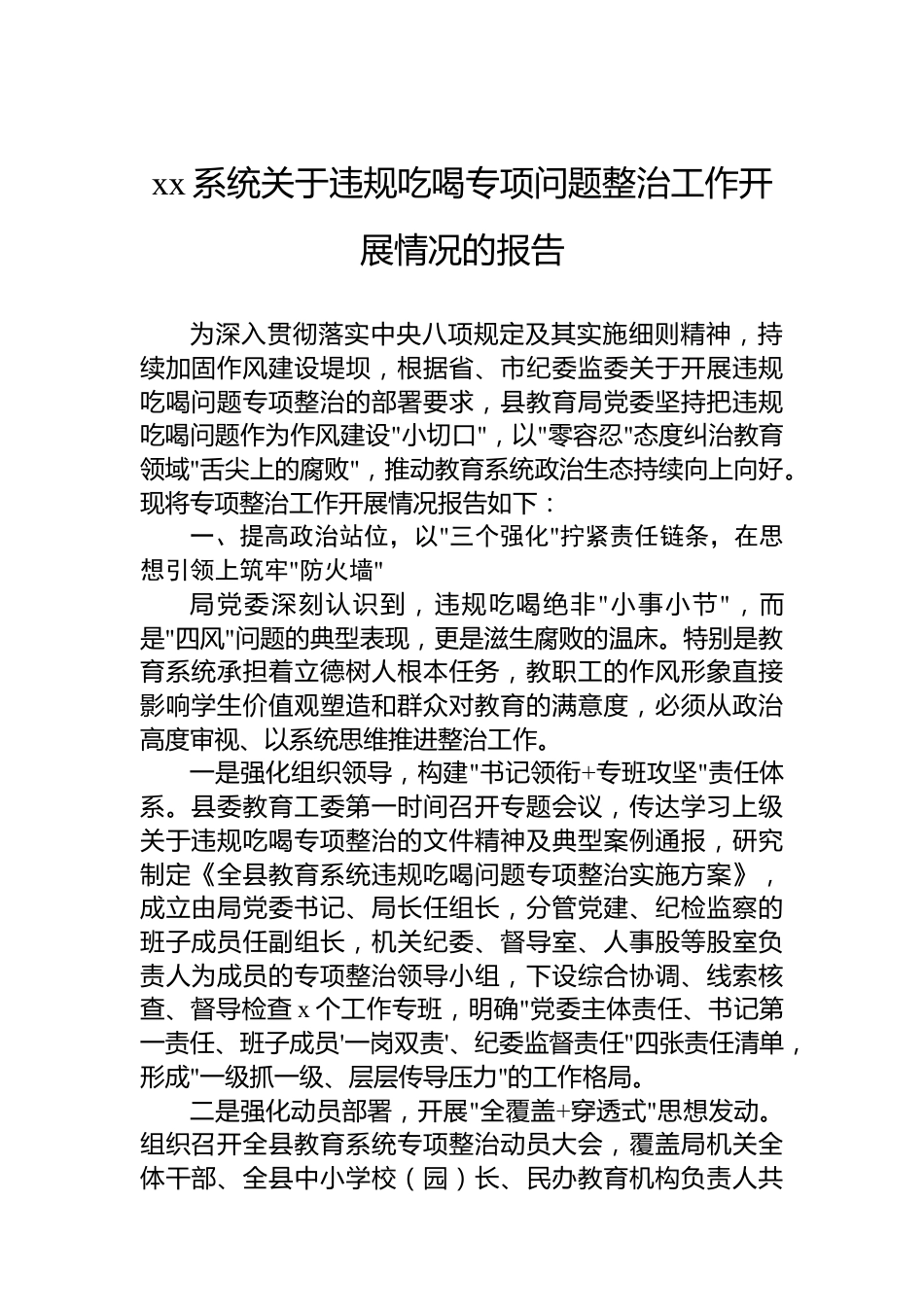 關于違規(guī)吃喝專項問題整治工作開展情況的報告(2篇)目錄1.xx系統(tǒng)關于違規(guī)吃喝專項問題整治工作開展情況的報告...22.局機關黨支部關于違規(guī)吃喝專項問題整治工作開展情況的報告.............................................................................................9xx系統(tǒng)關于違規(guī)吃喝專項問題整治工作開展情況的報告為深入貫徹落實中央八項規(guī)定及其實施細則精神,持續(xù)加固作風建設堤壩,根據(jù)省、市紀委監(jiān)委關于開展違規(guī)吃喝問題專項整治的部署要求,縣教育局黨委堅持把違規(guī)吃喝問題作為作風建設"小切口",以"零容忍"態(tài)度糾治教育領域"舌尖上的腐敗",推動教...