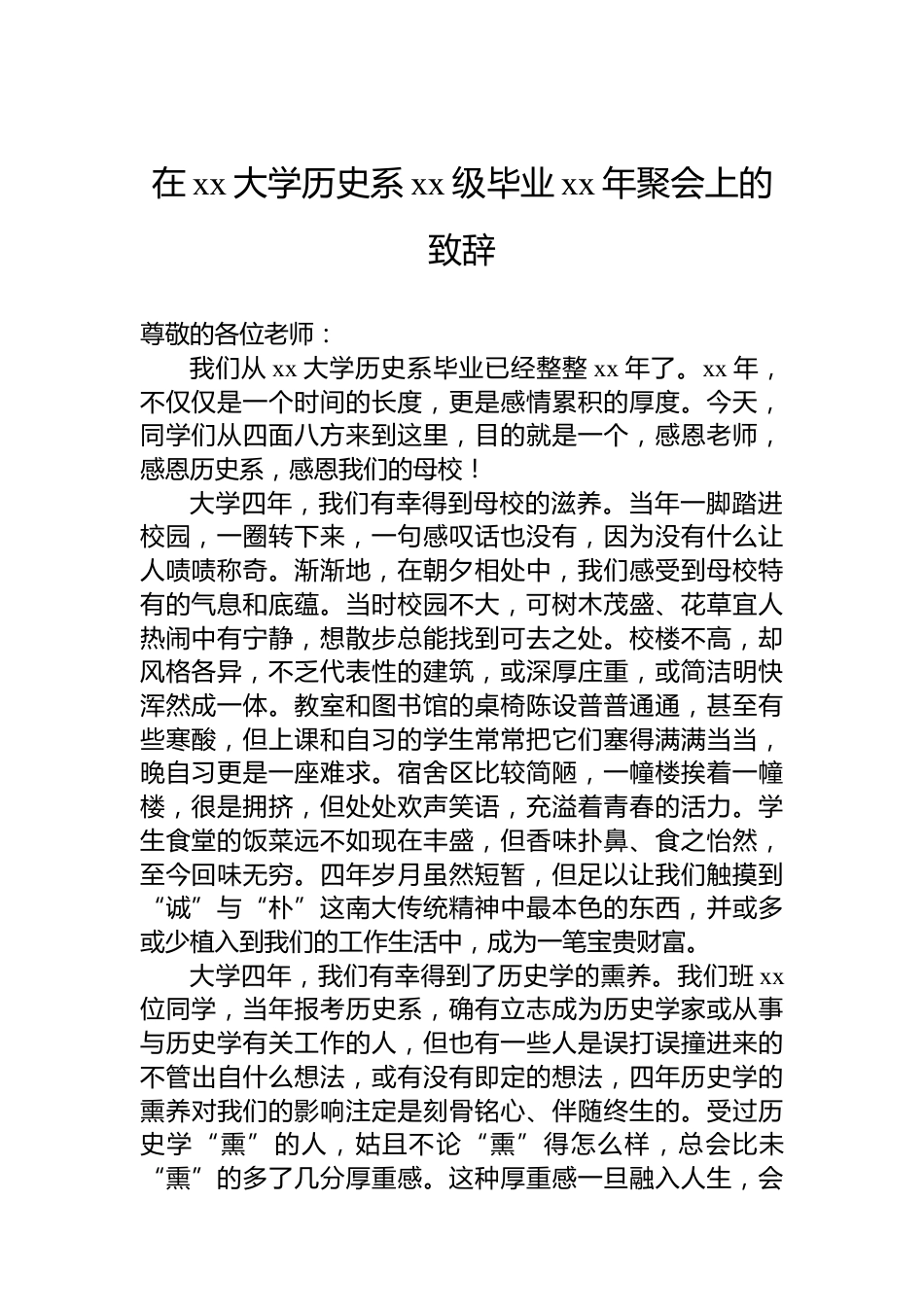 在xx大學(xué)xx班畢業(yè)xx年聚會上的發(fā)言、致辭、發(fā)言材料匯編(7篇)目錄1.在xx大學(xué)歷史系xx級畢業(yè)xx年聚會上的致辭...................22.在xx大學(xué)中文系歷史系xx級同學(xué)畢業(yè)xx年聚會上的致辭.....................................................................................................53.在xx大學(xué)中文系歷史系xx級同學(xué)畢業(yè)xx年聚會上的致辭.....................................................................................................74.在xx校友xx年新春聚會上的發(fā)言.......................................95.在xx校友xx年新春聚會上的講話......