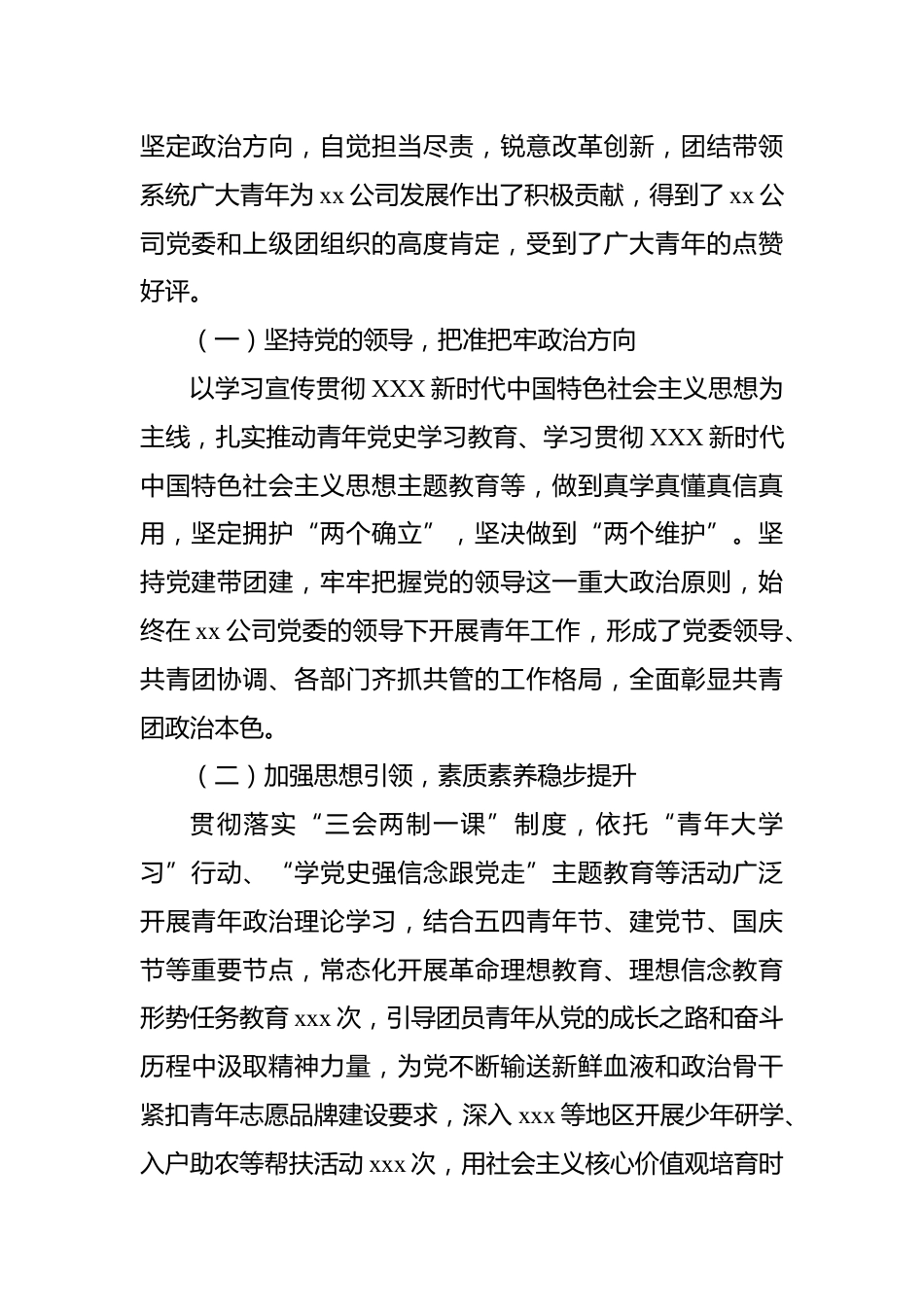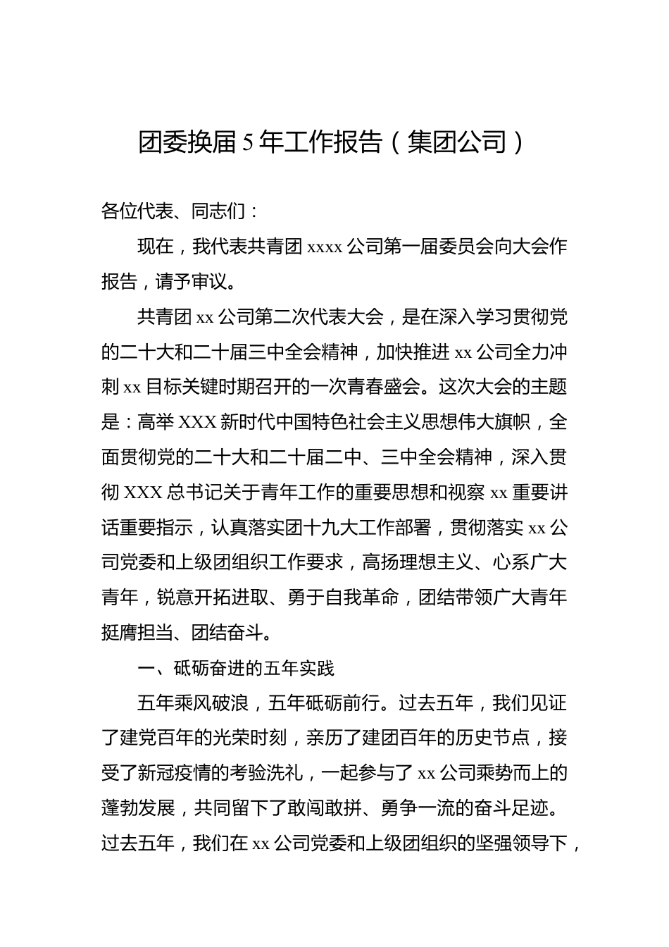 團委換屆5年工作報告(集團公司)各位代表、同志們:現(xiàn)在,我代表共青團xxxx公司第一屆委員會向大會作報告,請予審議。共青團xx公司第二次代表大會,是在深入學(xué)習(xí)貫徹黨的二十大和二十屆三中全會精神,加快推進(jìn)xx公司全力沖刺xx目標(biāo)關(guān)鍵時期召開的一次青春盛會。這次大會的主題是:高舉XXX新時代中國特色社會主義思想偉大旗幟,全面貫徹黨的二十大和二十屆二中、三中全會精神,深入貫徹XXX總書記關(guān)于青年工作的重要思想和視察xx重要講話重要指示,認(rèn)真落實團十九大工作部署,貫徹落實xx公司黨委和上級團組織工作要求,高揚理想主義、心系廣大青年,銳意開拓進(jìn)取、勇于自...