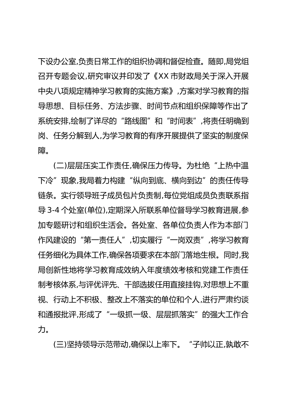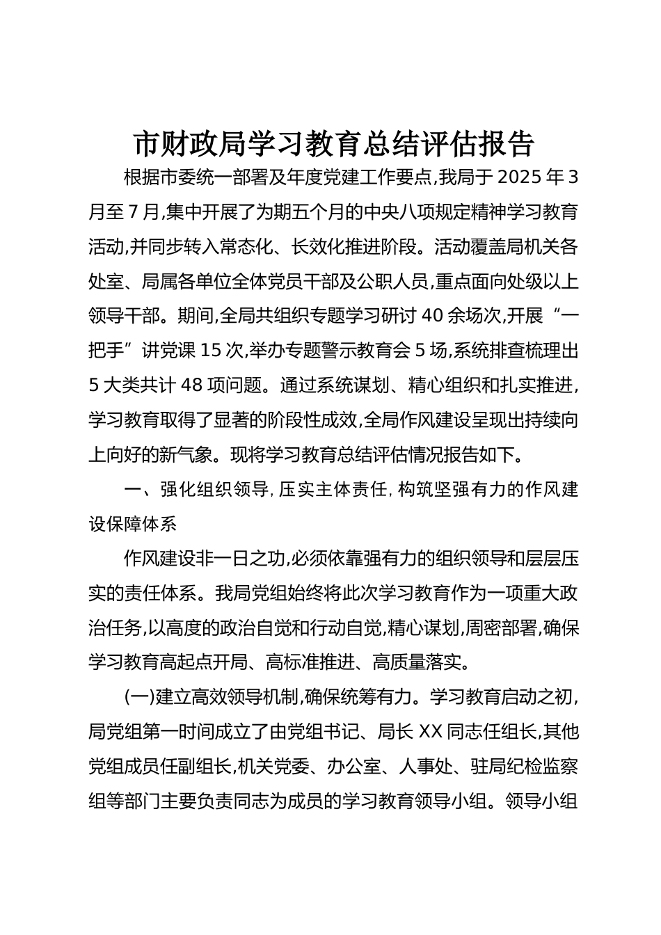 市財政局學習教育總結(jié)評估報告根據(jù)市委統(tǒng)一部署及年度黨建工作要點,我局于2025年3月至7月,集中開展了為期五個月的中央八項規(guī)定精神學習教育活動,并同步轉(zhuǎn)入常態(tài)化、長效化推進階段?;顒痈采w局機關各處室、局屬各單位全體黨員干部及公職人員,重點面向處級以上領導干部。期間,全局共組織專題學習研討40余場次,開展“一把手”講黨課15次,舉辦專題警示教育會5場,系統(tǒng)排查梳理出5大類共計48項問題。通過系統(tǒng)謀劃、精心組織和扎實推進,學習教育取得了顯著的階段性成效,全局作風建設呈現(xiàn)出持續(xù)向上向好的新氣象。現(xiàn)將學習教育總結(jié)評估情況報告如下。一、強化組織領導,壓實主體...