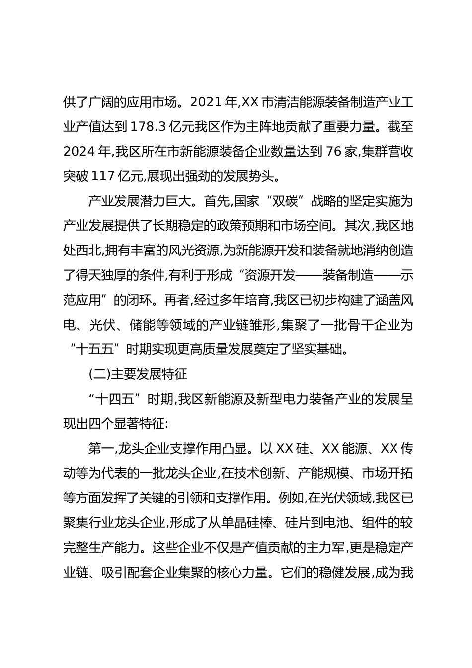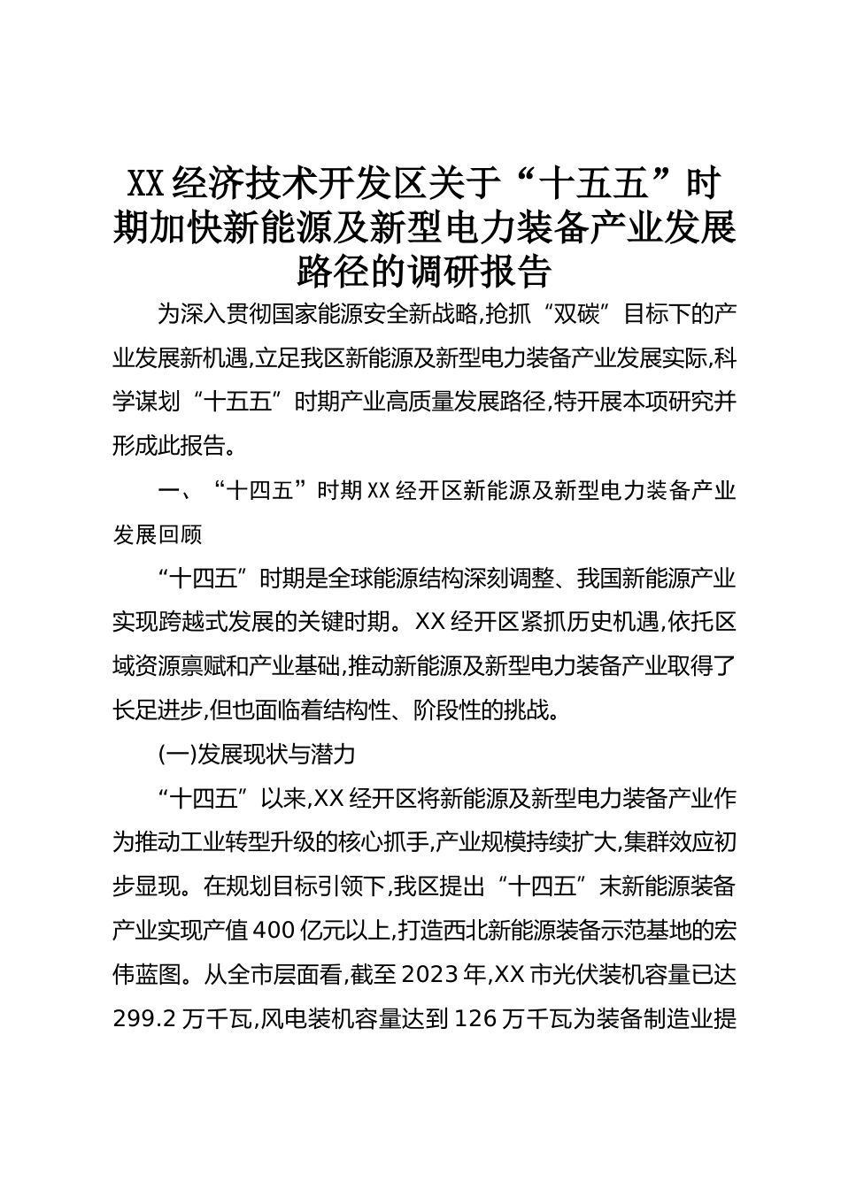XX經(jīng)濟(jì)技術(shù)開(kāi)發(fā)區(qū)關(guān)于“十五五”時(shí)期加快新能源及新型電力裝備產(chǎn)業(yè)發(fā)展路徑的調(diào)研報(bào)告為深入貫徹國(guó)家能源安全新戰(zhàn)略,搶抓“雙碳”目標(biāo)下的產(chǎn)業(yè)發(fā)展新機(jī)遇,立足我區(qū)新能源及新型電力裝備產(chǎn)業(yè)發(fā)展實(shí)際,科學(xué)謀劃“十五五”時(shí)期產(chǎn)業(yè)高質(zhì)量發(fā)展路徑,特開(kāi)展本項(xiàng)研究并形成此報(bào)告。一、“十四五”時(shí)期XX經(jīng)開(kāi)區(qū)新能源及新型電力裝備產(chǎn)業(yè)發(fā)展回顧“十四五”時(shí)期是全球能源結(jié)構(gòu)深刻調(diào)整、我國(guó)新能源產(chǎn)業(yè)實(shí)現(xiàn)跨越式發(fā)展的關(guān)鍵時(shí)期。XX經(jīng)開(kāi)區(qū)緊抓歷史機(jī)遇,依托區(qū)域資源稟賦和產(chǎn)業(yè)基礎(chǔ),推動(dòng)新能源及新型電力裝備產(chǎn)業(yè)取得了長(zhǎng)足進(jìn)步,但也面臨著結(jié)構(gòu)性、階段性的挑戰(zhàn)。(一)發(fā)展現(xiàn)狀與潛...