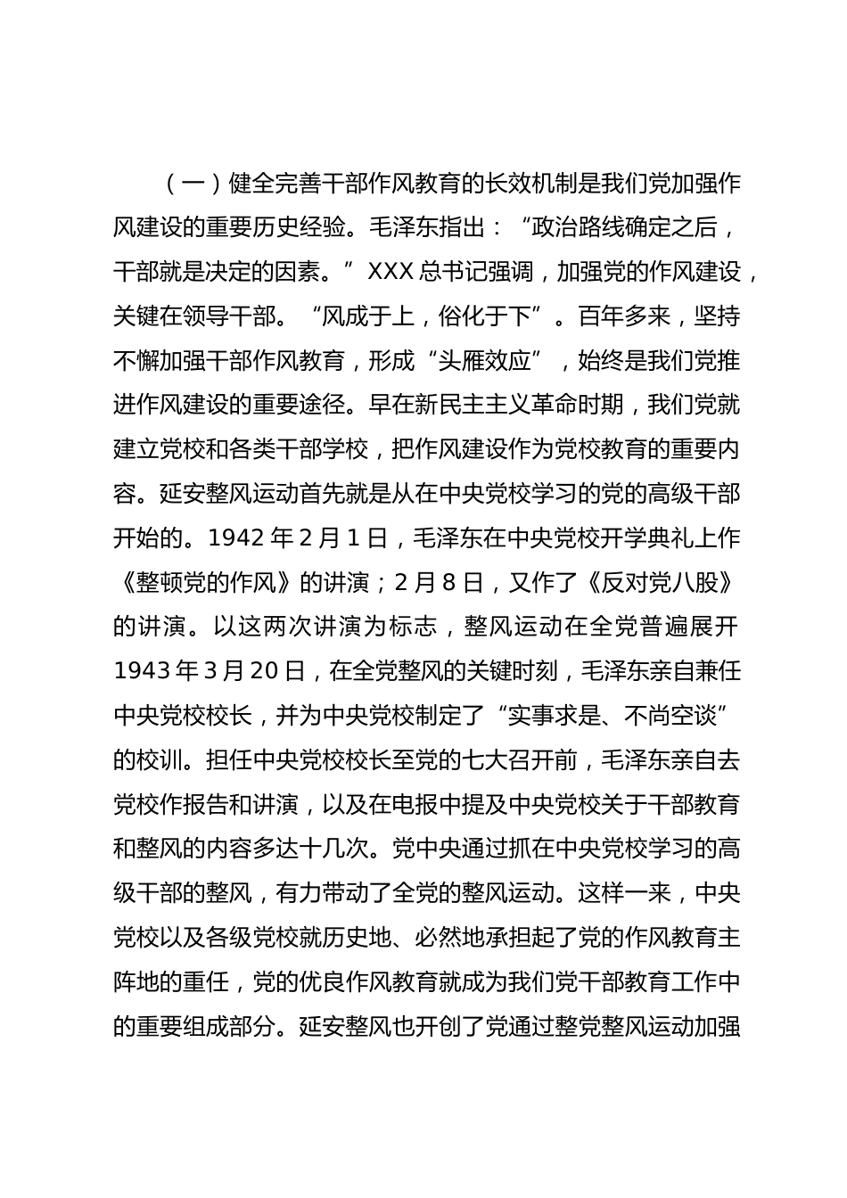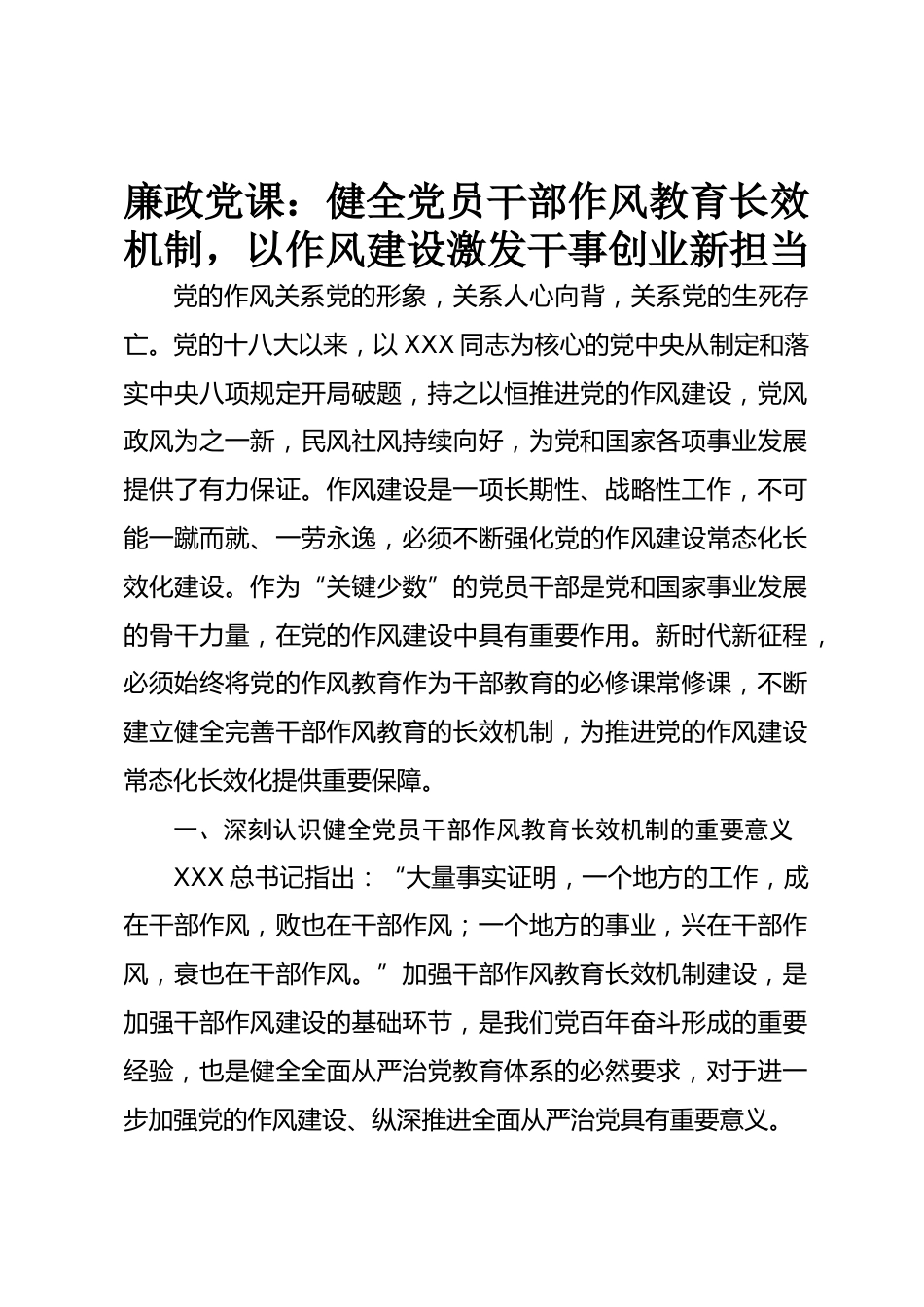 廉政黨課:健全黨員干部作風(fēng)教育長效機(jī)制,以作風(fēng)建設(shè)激發(fā)干事創(chuàng)業(yè)新?lián)?dāng)黨的作風(fēng)關(guān)系黨的形象,關(guān)系人心向背,關(guān)系黨的生死存亡。黨的十八大以來,以XXX同志為核心的黨中央從制定和落實(shí)中央八項(xiàng)規(guī)定開局破題,持之以恒推進(jìn)黨的作風(fēng)建設(shè),黨風(fēng)政風(fēng)為之一新,民風(fēng)社風(fēng)持續(xù)向好,為黨和國家各項(xiàng)事業(yè)發(fā)展提供了有力保證。作風(fēng)建設(shè)是一項(xiàng)長期性、戰(zhàn)略性工作,不可能一蹴而就、一勞永逸,必須不斷強(qiáng)化黨的作風(fēng)建設(shè)常態(tài)化長效化建設(shè)。作為“關(guān)鍵少數(shù)”的黨員干部是黨和國家事業(yè)發(fā)展的骨干力量,在黨的作風(fēng)建設(shè)中具有重要作用。新時代新征程,必須始終將黨的作風(fēng)教育作為干部教...