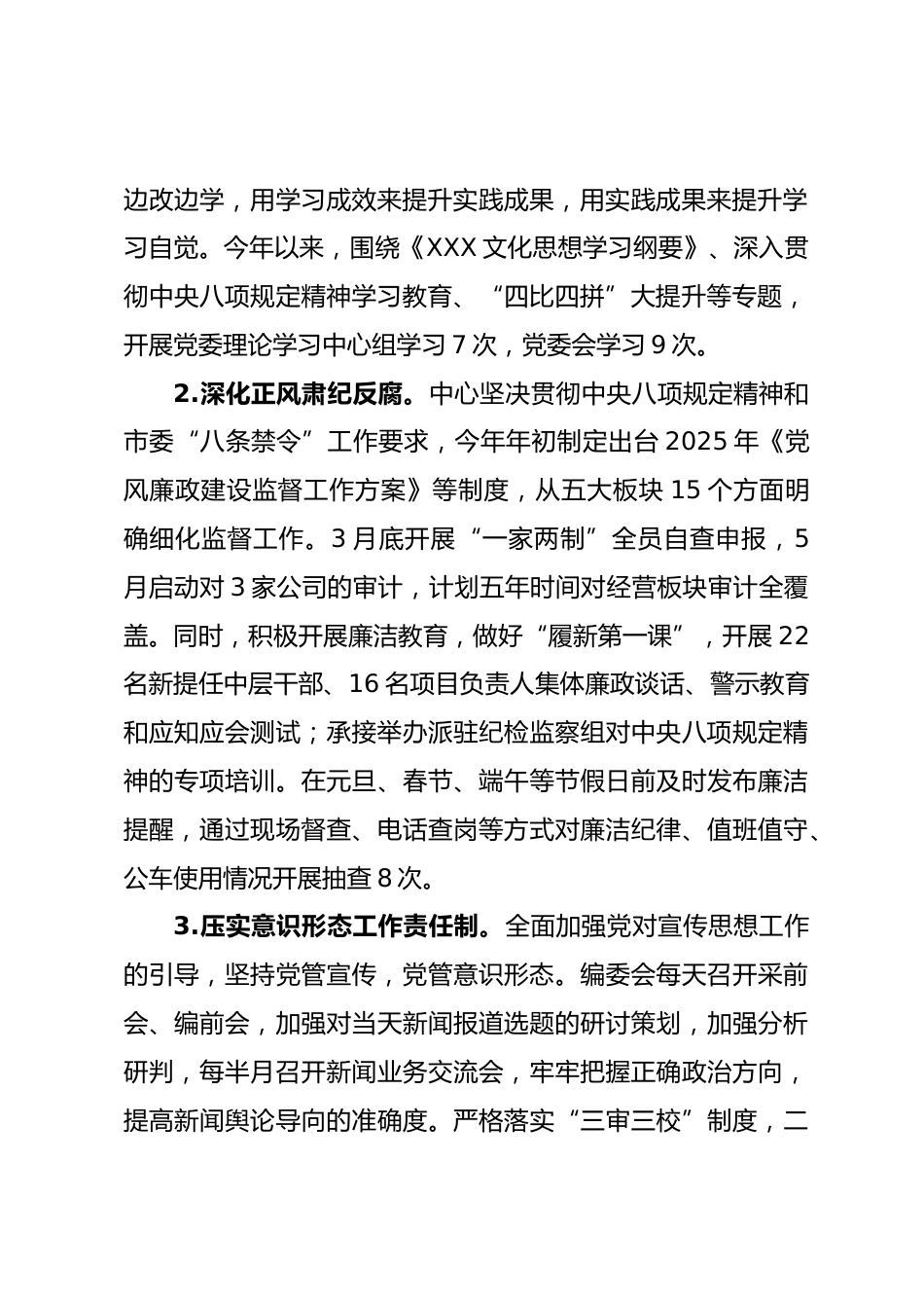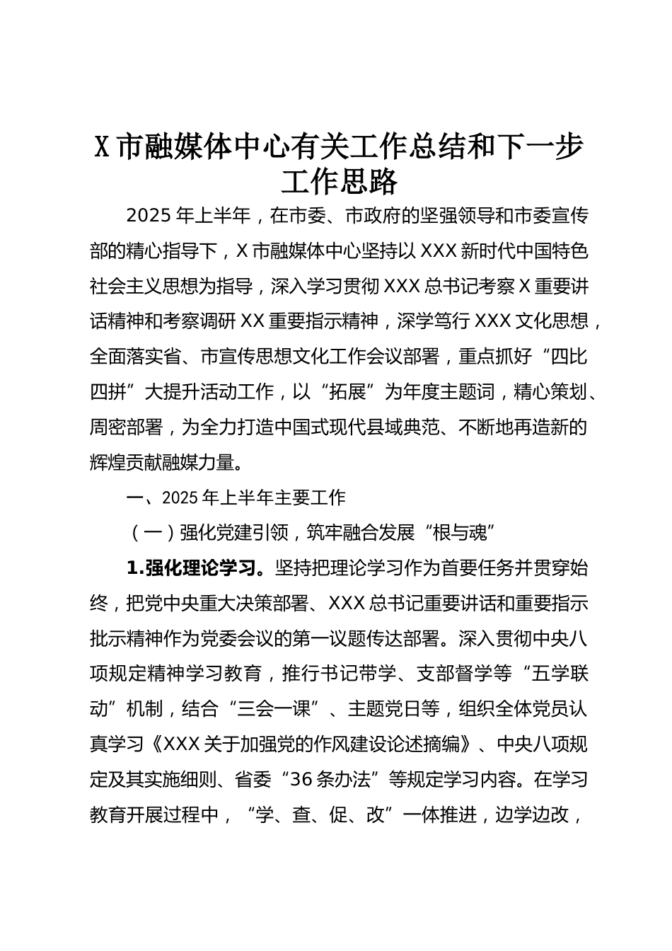 X市融媒體中心有關(guān)工作總結(jié)和下一步工作思路2025年上半年,在市委、市政府的堅(jiān)強(qiáng)領(lǐng)導(dǎo)和市委宣傳部的精心指導(dǎo)下,X市融媒體中心堅(jiān)持以XXX新時(shí)代中國(guó)特色社會(huì)主義思想為指導(dǎo),深入學(xué)習(xí)貫徹XXX總書(shū)記考察X重要講話精神和考察調(diào)研XX重要指示精神,深學(xué)篤行XXX文化思想,全面落實(shí)省、市宣傳思想文化工作會(huì)議部署,重點(diǎn)抓好“四比四拼”大提升活動(dòng)工作,以“拓展”為年度主題詞,精心策劃、周密部署,為全力打造中國(guó)式現(xiàn)代縣域典范、不斷地再造新的輝煌貢獻(xiàn)融媒力量。一、2025年上半年主要工作(一)強(qiáng)化黨建引領(lǐng),筑牢融合發(fā)展“根與魂”1.強(qiáng)化理論學(xué)習(xí)。堅(jiān)持把理論學(xué)習(xí)作為首...