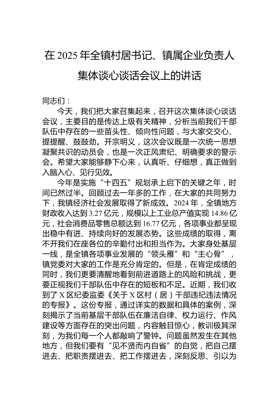 在2025年全鎮(zhèn)村居書記、鎮(zhèn)屬企業(yè)負(fù)責(zé)人集體談心談話會議上的講話VIP免費(fèi)