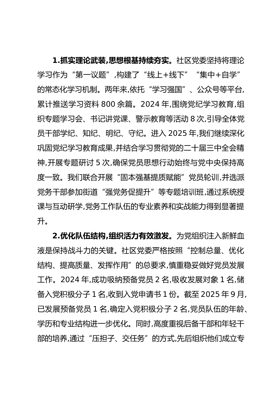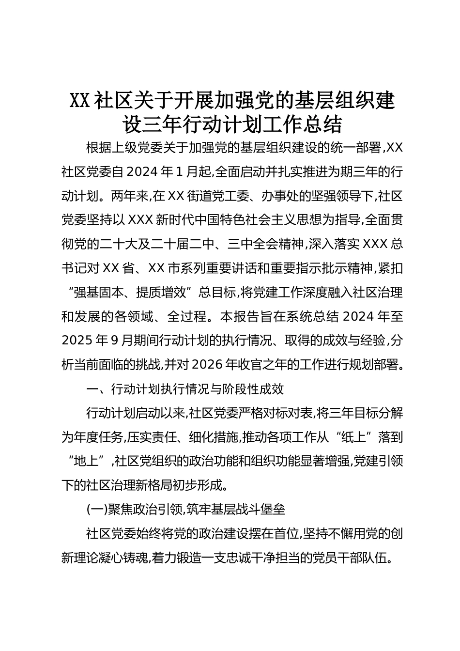 XX社區(qū)關(guān)于開(kāi)展加強(qiáng)黨的基層組織建設(shè)三年行動(dòng)計(jì)劃工作總結(jié)根據(jù)上級(jí)黨委關(guān)于加強(qiáng)黨的基層組織建設(shè)的統(tǒng)一部署,XX社區(qū)黨委自2024年1月起,全面啟動(dòng)并扎實(shí)推進(jìn)為期三年的行動(dòng)計(jì)劃。兩年來(lái),在XX街道黨工委、辦事處的堅(jiān)強(qiáng)領(lǐng)導(dǎo)下,社區(qū)黨委堅(jiān)持以XXX新時(shí)代中國(guó)特色社會(huì)主義思想為指導(dǎo),全面貫徹黨的二十大及二十屆二中、三中全會(huì)精神,深入落實(shí)XXX總書(shū)記對(duì)XX省、XX市系列重要講話和重要指示批示精神,緊扣“強(qiáng)基固本、提質(zhì)增效”總目標(biāo),將黨建工作深度融入社區(qū)治理和發(fā)展的各領(lǐng)域、全過(guò)程。本報(bào)告旨在系統(tǒng)總結(jié)2024年至2025年9月期間行動(dòng)計(jì)劃的執(zhí)行情況、取得的成效與經(jīng)驗(yàn),分析當(dāng)前面...